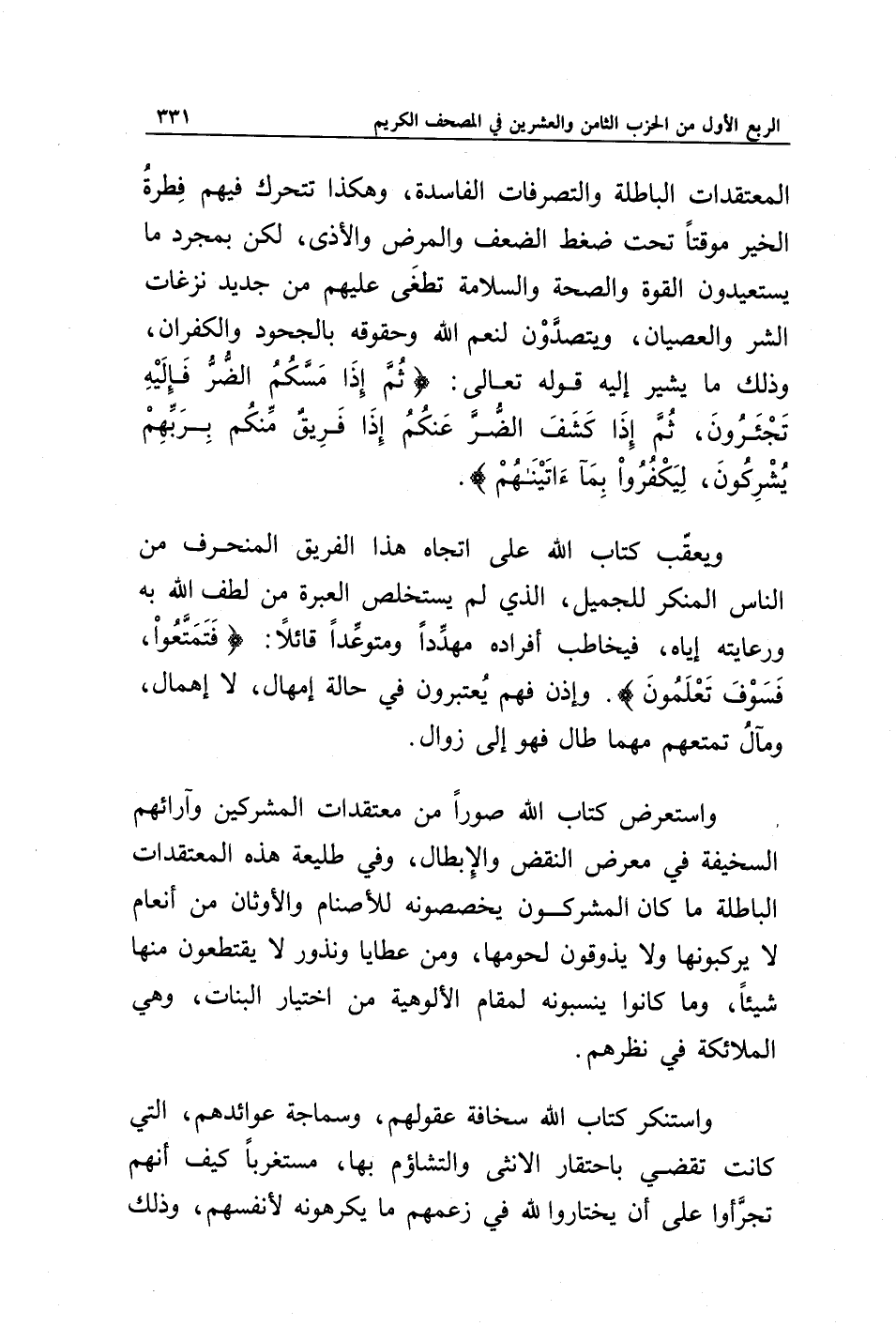 المعتقدات الباطلة والتصرفات الفاسدة، وهكذا تتحرك فيهم فطرة الخير مؤقتا، تحت ضغط الضعف والمرض والأذى، لكن بمجرد ما يستعيدون القوة والصحة والسلامة، تطغى عليهم من جديد نزغات الشر والعصيان، ويتصدون لنعم الله وحقوقه بالجحود والكفران، وذلك ما يشير إليه قوله تعالى: {ثُمَّ إِذَا مَسَّكُمُ الضُّرُّ فَإِلَيْهِ تَجْأَرُونَ * ثُمَّ إِذَا كَشَفَ الضُّرَّ عَنْكُمْ إِذَا فَرِيقٌ مِنْكُمْ بِرَبِّهِمْ يُشْرِكُونَ * لِيَكْفُرُوا بِمَا آتَيْنَاهُمْ}.