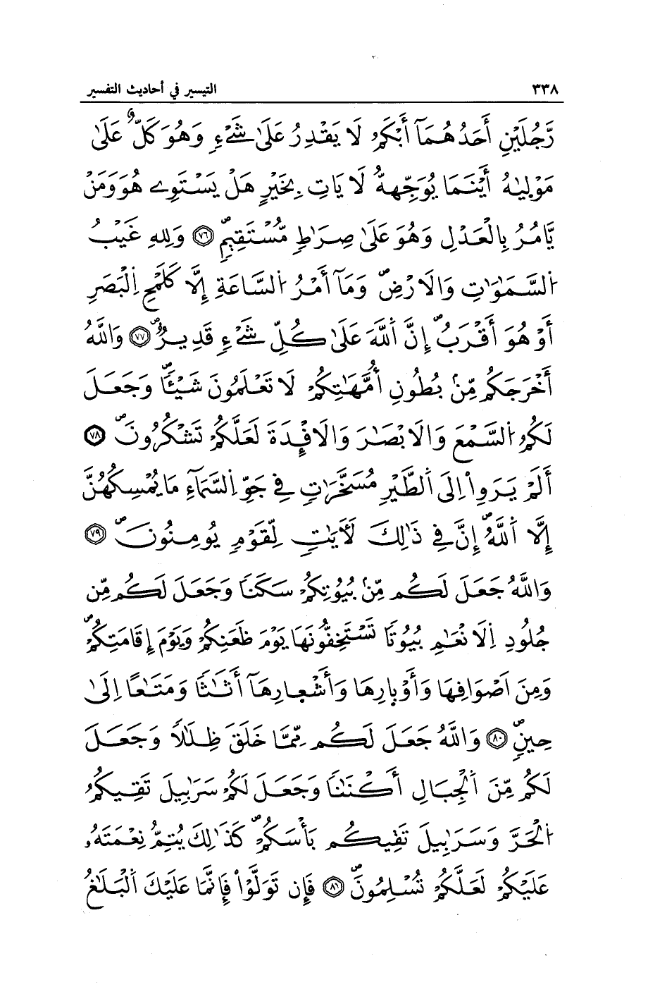 رَجُلَيْنِ أَحَدُهُمَا أَبْكَمُ لَا يَقْدِرُ عَلَى شَيْءٍ وَهُوَ كَلٌّ عَلَى مَوْلَاهُ أَيْنَمَا يُوَجِّهْهُ لَا يَأْتِ بِخَيْرٍ هَلْ يَسْتَوِي هُوَ وَمَنْ يَأْمُرُ بِالْعَدْلِ وَهُوَ عَلَى صِرَاطٍ مُسْتَقِيمٍ (76) وَلِلَّهِ غَيْبُ السَّمَاوَاتِ وَالْأَرْضِ وَمَا أَمْرُ السَّاعَةِ إِلَّا كَلَمْحِ الْبَصَرِ أَوْ هُوَ أَقْرَبُ إِنَّ اللَّهَ عَلَى كُلِّ شَيْءٍ قَدِيرٌ (77) وَاللَّهُ أَخْرَجَكُمْ مِنْ بُطُونِ أُمَّهَاتِكُمْ لَا تَعْلَمُونَ شَيْئًا وَجَعَلَ لَكُمُ السَّمْعَ وَالْأَبْصَارَ وَالْأَفْئِدَةَ لَعَلَّكُمْ تَشْكُرُونَ (78) أَلَمْ يَرَوْا إِلَى الطَّيْرِ مُسَخَّرَاتٍ فِي جَوِّ السَّمَاءِ مَا يُمْسِكُهُنَّ إِلَّا اللَّهُ إِنَّ فِي ذَلِكَ لَآيَاتٍ لِقَوْمٍ يُؤْمِنُونَ (79) وَاللَّهُ جَعَلَ لَكُمْ مِنْ بُيُوتِكُمْ سَكَنًا وَجَعَلَ لَكُمْ مِنْ جُلُودِ الْأَنْعَامِ بُيُوتًا تَسْتَخِفُّونَهَا يَوْمَ ظَعْنِكُمْ وَيَوْمَ إِقَامَتِكُمْ وَمِنْ أَصْوَافِهَا وَأَوْبَارِهَا وَأَشْعَارِهَا أَثَاثًا وَمَتَاعًا إِلَى حِينٍ (80) وَاللَّهُ جَعَلَ لَكُمْ مِمَّا خَلَقَ ظِلَالًا وَجَعَلَ لَكُمْ مِنَ الْجِبَالِ أَكْنَانًا وَجَعَلَ لَكُمْ سَرَابِيلَ تَقِيكُمُ الْحَرَّ وَسَرَابِيلَ تَقِيكُمْ بَأْسَكُمْ كَذَلِكَ يُتِمُّ نِعْمَتَهُ عَلَيْكُمْ لَعَلَّكُمْ تُسْلِمُونَ (81) فَإِنْ تَوَلَّوْا فَإِنَّمَا عَلَيْكَ الْبَلَاغُ