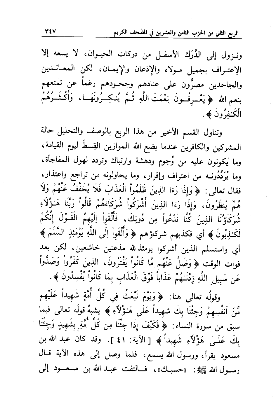 وتناول القسم الأخير من هذا الربع بالوصف والتحليل حالة المشركين والكافرين عندما يضع الله الموازين القسط ليوم القيامة، وما يكونون عليه من وجوم ودهشة وارتباك وتردد لهول المفاجأة، وما يرددونه من اعتراف وإقرار، وما يحاولونه من تراجع واعتذار، فقال تعالى: {وَإِذَا رَأَى الَّذِينَ ظَلَمُوا الْعَذَابَ فَلَا يُخَفَّفُ عَنْهُمْ وَلَا هُمْ يُنْظَرُونَ * وَإِذَا رَأَى الَّذِينَ أَشْرَكُوا شُرَكَاءَهُمْ قَالُوا رَبَّنَا هَؤُلَاءِ شُرَكَاؤُنَا الَّذِينَ كُنَّا نَدْعُو مِنْ دُونِكَ فَأَلْقَوْا إِلَيْهِمُ الْقَوْلَ إِنَّكُمْ لَكَاذِبُونَ}، أي: فكذبهم شركاؤهم، {وَأَلْقَوْا إِلَى اللَّهِ يَوْمَئِذٍ السَّلَمَ}، أي: واستسلم الذين أشركوا يومئذ لله مذعنين خاشعين، لكن بعد فوات الوقت. {وَضَلَّ عَنْهُمْ مَا كَانُوا يَفْتَرُونَ * الَّذِينَ كَفَرُوا وَصَدُّوا عَنْ سَبِيلِ اللَّهِ زِدْنَاهُمْ عَذَابًا فَوْقَ الْعَذَابِ بِمَا كَانُوا يُفْسِدُونَ}.