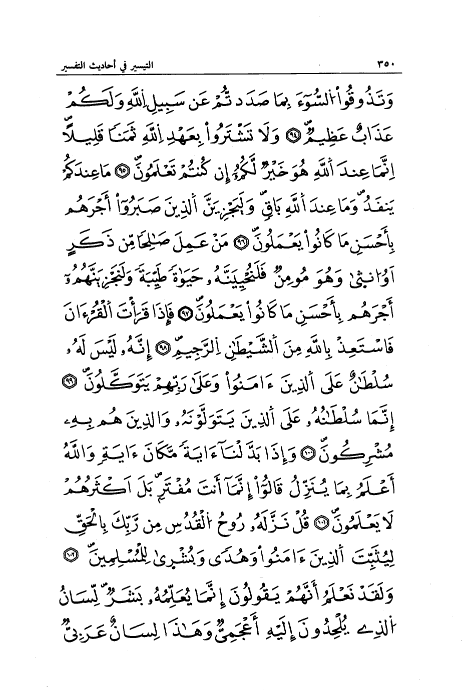 وَتَذُوقُوا السُّوءَ بِمَا صَدَدْتُمْ عَنْ سَبِيلِ اللَّهِ وَلَكُمْ عَذَابٌ عَظِيمٌ (94) وَلَا تَشْتَرُوا بِعَهْدِ اللَّهِ ثَمَنًا قَلِيلًا إِنَّمَا عِنْدَ اللَّهِ هُوَ خَيْرٌ لَكُمْ إِنْ كُنْتُمْ تَعْلَمُونَ (95) مَا عِنْدَكُمْ يَنْفَدُ وَمَا عِنْدَ اللَّهِ بَاقٍ وَلَنَجْزِيَنَّ الَّذِينَ صَبَرُوا أَجْرَهُمْ بِأَحْسَنِ مَا كَانُوا يَعْمَلُونَ (96) مَنْ عَمِلَ صَالِحًا مِنْ ذَكَرٍ أَوْ أُنْثَى وَهُوَ مُؤْمِنٌ فَلَنُحْيِيَنَّهُ حَيَاةً طَيِّبَةً وَلَنَجْزِيَنَّهُمْ أَجْرَهُمْ بِأَحْسَنِ مَا كَانُوا يَعْمَلُونَ (97) فَإِذَا قَرَأْتَ الْقُرْآنَ فَاسْتَعِذْ بِاللَّهِ مِنَ الشَّيْطَانِ الرَّجِيمِ (98) إِنَّهُ لَيْسَ لَهُ سُلْطَانٌ عَلَى الَّذِينَ آمَنُوا وَعَلَى رَبِّهِمْ يَتَوَكَّلُونَ (99) إِنَّمَا سُلْطَانُهُ عَلَى الَّذِينَ يَتَوَلَّوْنَهُ وَالَّذِينَ هُمْ بِهِ مُشْرِكُونَ (100) وَإِذَا بَدَّلْنَا آيَةً مَكَانَ آيَةٍ وَاللَّهُ أَعْلَمُ بِمَا يُنَزِّلُ قَالُوا إِنَّمَا أَنْتَ مُفْتَرٍ بَلْ أَكْثَرُهُمْ لَا يَعْلَمُونَ (101) قُلْ نَزَّلَهُ رُوحُ الْقُدُسِ مِنْ رَبِّكَ بِالْحَقِّ لِيُثَبِّتَ الَّذِينَ آمَنُوا وَهُدًى وَبُشْرَى لِلْمُسْلِمِينَ (102) وَلَقَدْ نَعْلَمُ أَنَّهُمْ يَقُولُونَ إِنَّمَا يُعَلِّمُهُ بَشَرٌ لِسَانُ الَّذِي يُلْحِدُونَ إِلَيْهِ أَعْجَمِيٌّ وَهَذَا لِسَانٌ عَرَبِيٌّ
