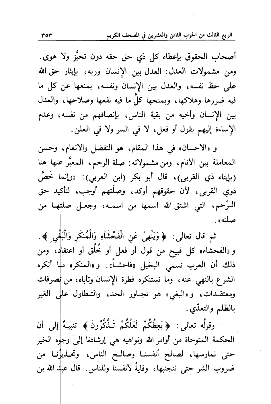 و" الإحسان " في هذا المقام، هو التفضل والإنعام، وحسن المعاملة بين الأنام، ومن مشمولاته: صلة الرحم، المعبر عنها هنا: (بإيتاء ذي القربى)، قال أبو بكر (ابن العربي): " وإنما خص ذوي القربى، لأن حقوقهم أوكد، وصلتهم أوجب، لتأكيد حق الرحم، التي اشتق الله اسمها من اسمه، وجعل صلتها من صلته ".