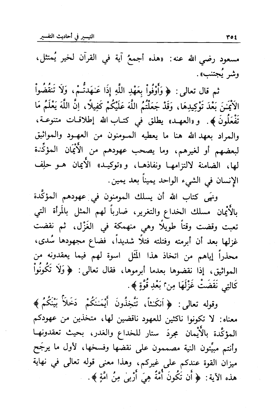ثم قال تعالى: {وَأَوْفُوا بِعَهْدِ اللَّهِ إِذَا عَاهَدْتُمْ وَلَا تَنْقُضُوا الْأَيْمَانَ بَعْدَ تَوْكِيدِهَا وَقَدْ جَعَلْتُمُ اللَّهَ عَلَيْكُمْ كَفِيلًا إِنَّ اللَّهَ يَعْلَمُ مَا تَفْعَلُونَ}. و " العهد " يطلق في كتاب الله إطلاقات متنوعة، والمراد بعهد الله هنا: ما يعطيه المؤمنون من العهود والمواثيق لبعضهم أو لغيرهم، وما يصحب عهودهم من الأيمان المؤكدة لها، الضامنة لاتزامها ونفاذها، و " توكيد " الأيمان: هو حلف الإنسان في الشيء الواحد يمينا بعد يمين.