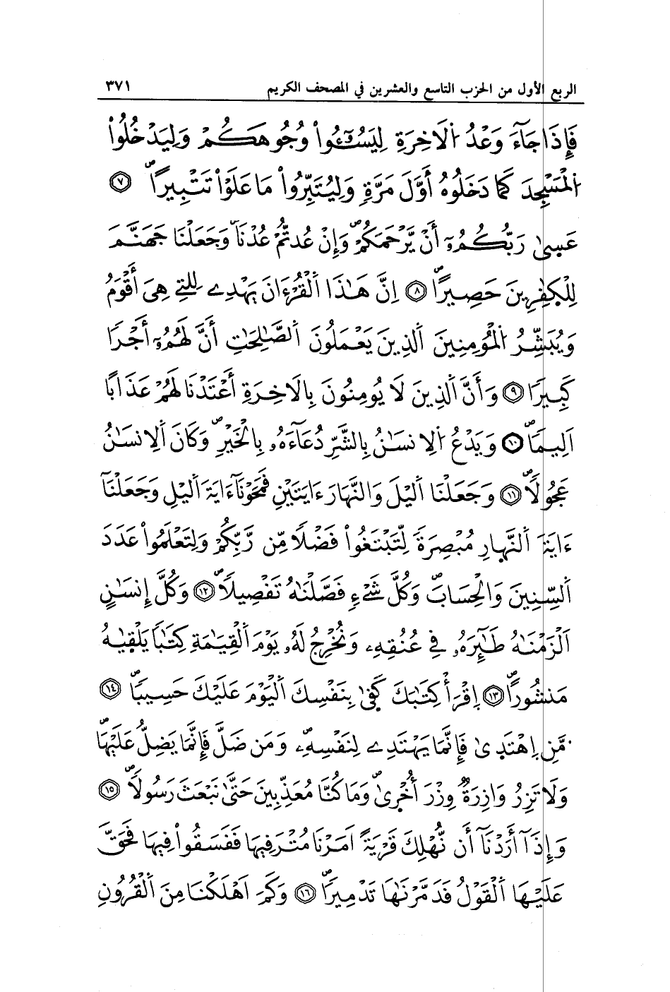 فَإِذَا جَاءَ وَعْدُ الْآخِرَةِ لِيَسُوءُوا وُجُوهَكُمْ وَلِيَدْخُلُوا الْمَسْجِدَ كَمَا دَخَلُوهُ أَوَّلَ مَرَّةٍ وَلِيُتَبِّرُوا مَا عَلَوْا تَتْبِيرًا (7) عَسَى رَبُّكُمْ أَنْ يَرْحَمَكُمْ وَإِنْ عُدْتُمْ عُدْنَا وَجَعَلْنَا جَهَنَّمَ لِلْكَافِرِينَ حَصِيرًا (8) إِنَّ هَذَا الْقُرْآنَ يَهْدِي لِلَّتِي هِيَ أَقْوَمُ وَيُبَشِّرُ الْمُؤْمِنِينَ الَّذِينَ يَعْمَلُونَ الصَّالِحَاتِ أَنَّ لَهُمْ أَجْرًا كَبِيرًا (9) وَأَنَّ الَّذِينَ لَا يُؤْمِنُونَ بِالْآخِرَةِ أَعْتَدْنَا لَهُمْ عَذَابًا أَلِيمًا (10) وَيَدْعُ الْإِنْسَانُ بِالشَّرِّ دُعَاءَهُ بِالْخَيْرِ وَكَانَ الْإِنْسَانُ عَجُولًا (11) وَجَعَلْنَا اللَّيْلَ وَالنَّهَارَ آيَتَيْنِ فَمَحَوْنَا آيَةَ اللَّيْلِ وَجَعَلْنَا آيَةَ النَّهَارِ مُبْصِرَةً لِتَبْتَغُوا فَضْلًا مِنْ رَبِّكُمْ وَلِتَعْلَمُوا عَدَدَ السِّنِينَ وَالْحِسَابَ وَكُلَّ شَيْءٍ فَصَّلْنَاهُ تَفْصِيلًا (12) وَكُلَّ إِنْسَانٍ أَلْزَمْنَاهُ طَائِرَهُ فِي عُنُقِهِ وَنُخْرِجُ لَهُ يَوْمَ الْقِيَامَةِ كِتَابًا يَلْقَاهُ مَنْشُورًا (13) اقْرَأْ كِتَابَكَ كَفَى بِنَفْسِكَ الْيَوْمَ عَلَيْكَ حَسِيبًا (14) مَنِ اهْتَدَى فَإِنَّمَا يَهْتَدِي لِنَفْسِهِ وَمَنْ ضَلَّ فَإِنَّمَا يَضِلُّ عَلَيْهَا وَلَا تَزِرُ وَازِرَةٌ وِزْرَ أُخْرَى وَمَا كُنَّا مُعَذِّبِينَ حَتَّى نَبْعَثَ رَسُولًا (15) وَإِذَا أَرَدْنَا أَنْ نُهْلِكَ قَرْيَةً أَمَرْنَا مُتْرَفِيهَا فَفَسَقُوا فِيهَا فَحَقَّ عَلَيْهَا الْقَوْلُ فَدَمَّرْنَاهَا تَدْمِيرًا (16) وَكَمْ أَهْلَكْنَا مِنَ الْقُرُونِ