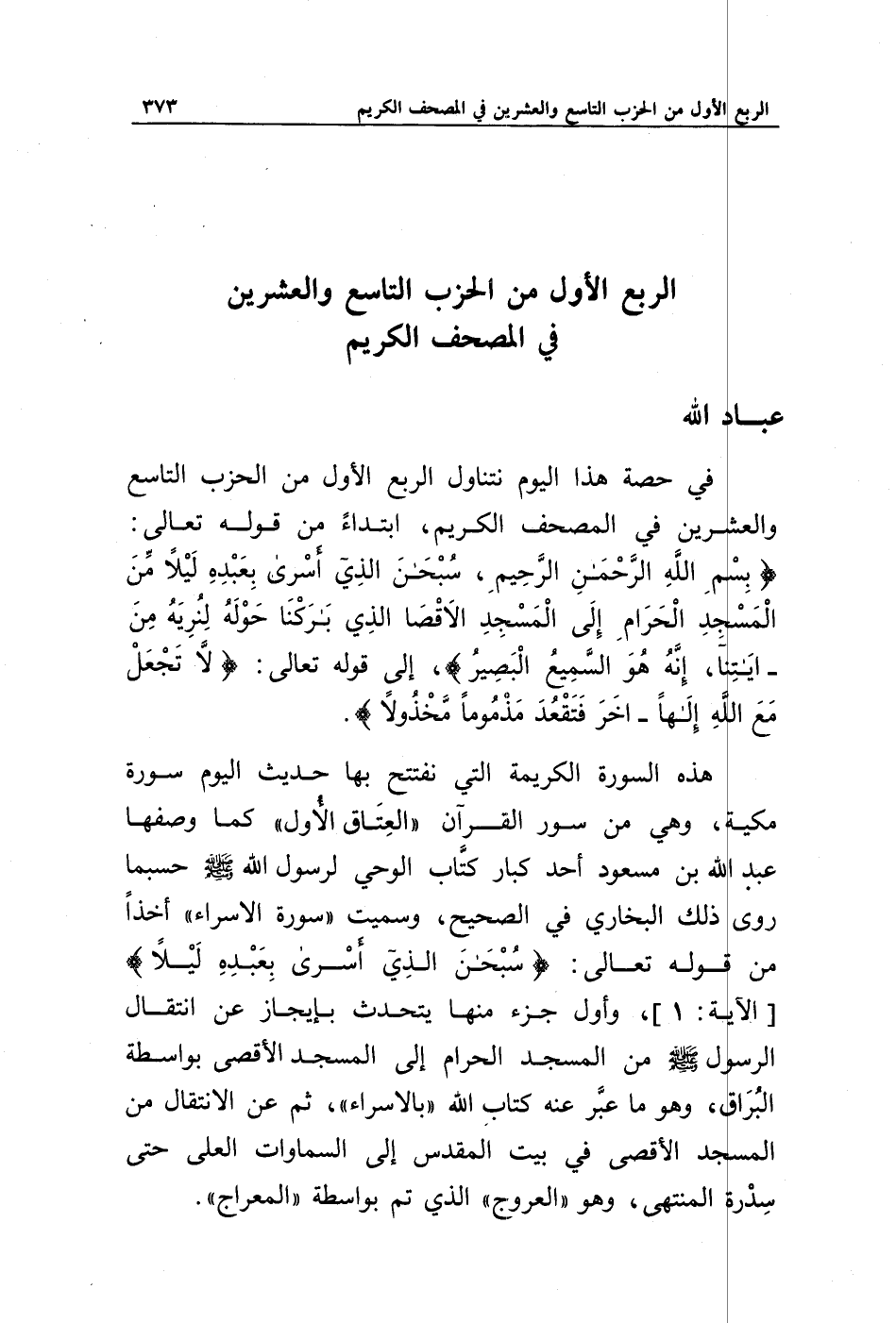 هذه السورة الكريمة التي نفتتح بها حديث اليوم سورة مكية، وهي من سور القرآن " العتاق الأول " كما وصفها عبد الله بن مسعود، أحد كبار كتاب الوحي لرسول الله صلى الله عليه وسلم، حسبما روى ذلك البخاري في الصحيح. وسميت " سورة الإسراء " أخذا من قوله تعالى: {سُبْحَانَ الَّذِي أَسْرَى بِعَبْدِهِ لَيْلًا} [الآية: 1]. وأول جزء منها يتحدث بإيجاز عن انتقال الرسول صلى الله عليه وسلم من المسجد الحرام إلى المسجد الأقصى بواسطة البراق، وهو ما عبر عنه كتاب الله " بالإسراء "، ثم عن الانتقال من المسجد الأقصى في بيت المقدس إلى السماوات العلى حتى سدرة المنتهى، وهو " العروج " الذي تم بواسطة " المعراج ".