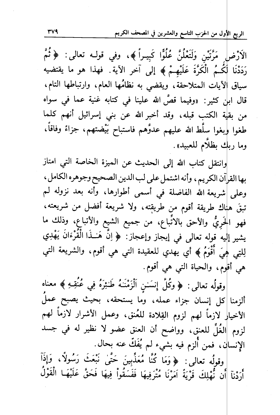 الْأَرْضِ مَرَّتَيْنِ وَلَتَعْلُنَّ عُلُوًّا كَبِيرًا}، وفي قوله تعالى: {ثُمَّ رَدَدْنَا لَكُمُ الْكَرَّةَ عَلَيْهِمْ} إلى آخر الآية. فهذا هو ما يقتضيه سياق الآيات المتلاحقة، ويقضي به نظامها العام، وارتباطها التام، قال ابن كثير: " وفيما قص الله علينا في كتابه غنية عما في سواه من بقية الكتب قبله، وقد أخبر الله عن بني إسرائيل أنهم كلما طغوا وبغوا سلط الله عليهم عدوهم فاستباح بيضتهم، جزاء وفاقا، وما ربك بظلام للعبيد ".