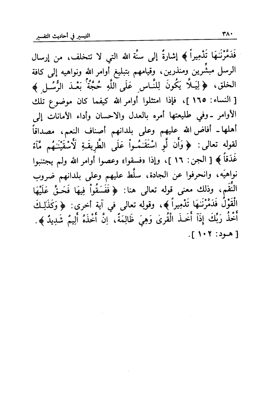 فَدَمَّرْنَاهَا تَدْمِيرًا} إشارة إلى سنة الله التي لا تتخلف، من إرسال الرسل مبشرين ومنذرين، وقيامهم بتبليغ أوامر الله ونواهيه إلى كافة الخلق، {لِئَلَّا يَكُونَ لِلنَّاسِ عَلَى اللَّهِ حُجَّةٌ بَعْدَ الرُّسُلِ} [النساء: 165]، فإذا امتثلوا أوامر الله كيفما كان موضوع تلك الأوامر - وفي طليعتها أمره بالعدل والإحسان وأداء الأمانات إلى أهلها- أفاض الله عليهم وعلى بلدانهم أصناف النعم، مصداقا لقوله تعالى: {وَأَلَّوِ اسْتَقَامُوا عَلَى الطَّرِيقَةِ لَأَسْقَيْنَاهُمْ مَاءً غَدَقًا} [الجن: 16]، وإذا " فسقوا " وعصوا أوامر الله ولم يجتنبوا نواهيه، وانحرفوا عن الجادة، سلط عليهم وعلى بلدانهم ضروب النقم، وذلك معنى قوله تعالى هنا: {فَفَسَقُوا فِيهَا فَحَقَّ عَلَيْهَا الْقَوْلُ فَدَمَّرْنَاهَا تَدْمِيرًا}، وقوله تعالى في آية أخرى: {وَكَذَلِكَ أَخْذُ رَبِّكَ إِذَا أَخَذَ الْقُرَى وَهِيَ ظَالِمَةٌ إِنَّ أَخْذَهُ أَلِيمٌ شَدِيدٌ} [هود: 102].