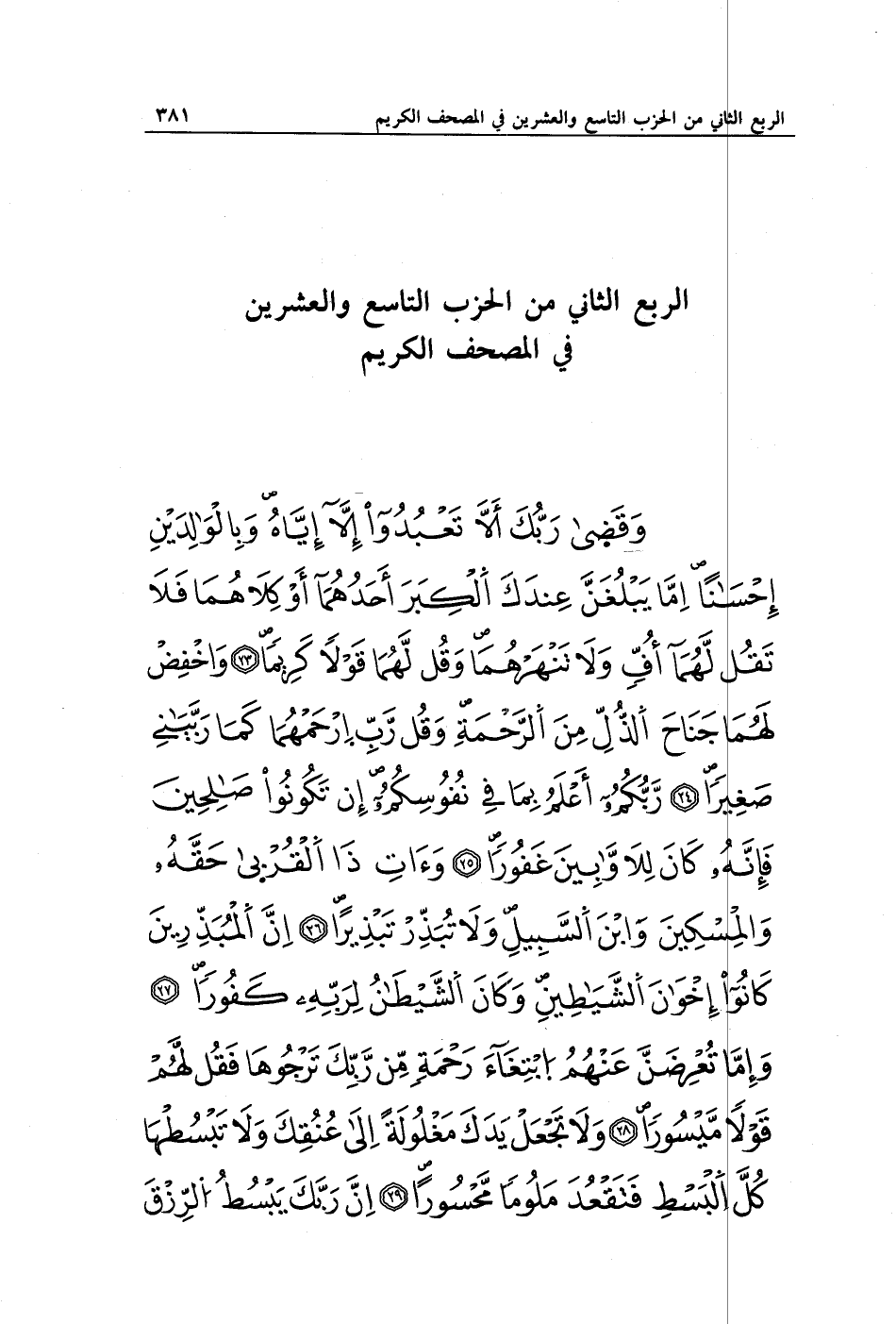 وَقَضَى رَبُّكَ أَلَّا تَعْبُدُوا إِلَّا إِيَّاهُ وَبِالْوَالِدَيْنِ إِحْسَانًا إِمَّا يَبْلُغَنَّ عِنْدَكَ الْكِبَرَ أَحَدُهُمَا أَوْ كِلَاهُمَا فَلَا تَقُلْ لَهُمَا أُفٍّ وَلَا تَنْهَرْهُمَا وَقُلْ لَهُمَا قَوْلًا كَرِيمًا (23) وَاخْفِضْ لَهُمَا جَنَاحَ الذُّلِّ مِنَ الرَّحْمَةِ وَقُلْ رَبِّ ارْحَمْهُمَا كَمَا رَبَّيَانِي صَغِيرًا (24) رَبُّكُمْ أَعْلَمُ بِمَا فِي نُفُوسِكُمْ إِنْ تَكُونُوا صَالِحِينَ فَإِنَّهُ كَانَ لِلْأَوَّابِينَ غَفُورًا (25) وَآتِ ذَا الْقُرْبَى حَقَّهُ وَالْمِسْكِينَ وَابْنَ السَّبِيلِ وَلَا تُبَذِّرْ تَبْذِيرًا (26) إِنَّ الْمُبَذِّرِينَ كَانُوا إِخْوَانَ الشَّيَاطِينِ وَكَانَ الشَّيْطَانُ لِرَبِّهِ كَفُورًا (27) وَإِمَّا تُعْرِضَنَّ عَنْهُمُ ابْتِغَاءَ رَحْمَةٍ مِنْ رَبِّكَ تَرْجُوهَا فَقُلْ لَهُمْ قَوْلًا مَيْسُورًا (28) وَلَا تَجْعَلْ يَدَكَ مَغْلُولَةً إِلَى عُنُقِكَ وَلَا تَبْسُطْهَا كُلَّ الْبَسْطِ فَتَقْعُدَ مَلُومًا مَحْسُورًا (29) إِنَّ رَبَّكَ يَبْسُطُ الرِّزْقَ
