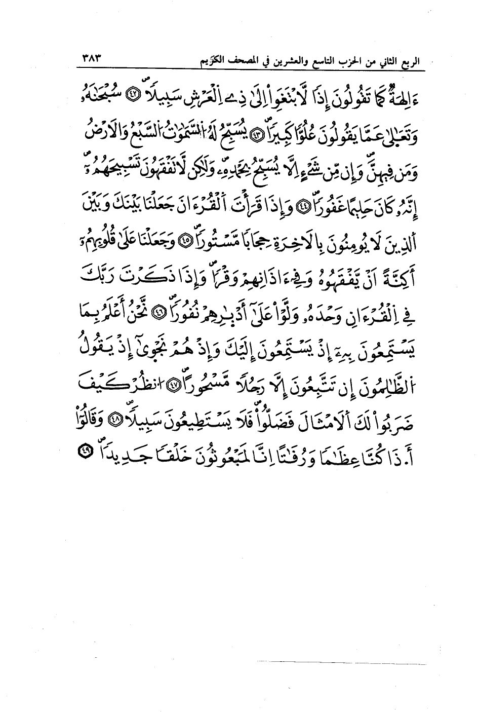 آلِهَةٌ كَمَا يَقُولُونَ إِذًا لَابْتَغَوْا إِلَى ذِي الْعَرْشِ سَبِيلًا (42) سُبْحَانَهُ وَتَعَالَى عَمَّا يَقُولُونَ عُلُوًّا كَبِيرًا (43) تُسَبِّحُ لَهُ السَّمَاوَاتُ السَّبْعُ وَالْأَرْضُ وَمَنْ فِيهِنَّ وَإِنْ مِنْ شَيْءٍ إِلَّا يُسَبِّحُ بِحَمْدِهِ وَلَكِنْ لَا تَفْقَهُونَ تَسْبِيحَهُمْ إِنَّهُ كَانَ حَلِيمًا غَفُورًا (44) وَإِذَا قَرَأْتَ الْقُرْآنَ جَعَلْنَا بَيْنَكَ وَبَيْنَ الَّذِينَ لَا يُؤْمِنُونَ بِالْآخِرَةِ حِجَابًا مَسْتُورًا (45) وَجَعَلْنَا عَلَى قُلُوبِهِمْ أَكِنَّةً أَنْ يَفْقَهُوهُ وَفِي آذَانِهِمْ وَقْرًا وَإِذَا ذَكَرْتَ رَبَّكَ فِي الْقُرْآنِ وَحْدَهُ وَلَّوْا عَلَى أَدْبَارِهِمْ نُفُورًا (46) نَحْنُ أَعْلَمُ بِمَا يَسْتَمِعُونَ بِهِ إِذْ يَسْتَمِعُونَ إِلَيْكَ وَإِذْ هُمْ نَجْوَى إِذْ يَقُولُ الظَّالِمُونَ إِنْ تَتَّبِعُونَ إِلَّا رَجُلًا مَسْحُورًا (47) انْظُرْ كَيْفَ ضَرَبُوا لَكَ الْأَمْثَالَ فَضَلُّوا فَلَا يَسْتَطِيعُونَ سَبِيلًا (48) وَقَالُوا أَإِذَا كُنَّا عِظَامًا وَرُفَاتًا أَإِنَّا لَمَبْعُوثُونَ خَلْقًا جَدِيدًا (49)