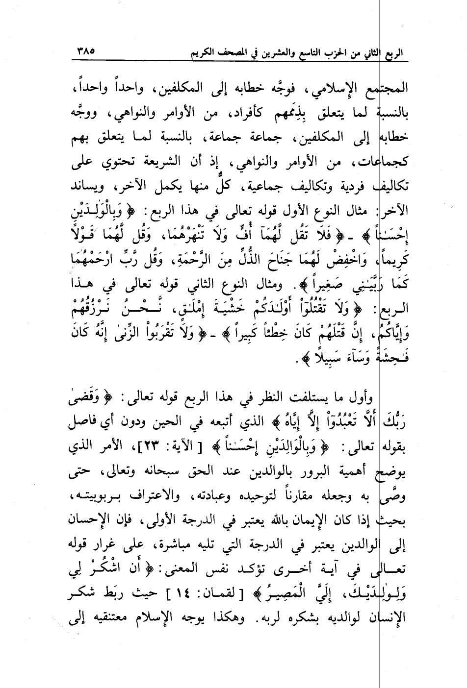 المجتمع الإسلامي، فوجه خطابه إلى المكلفين، واحدا واحدا، بالنسبة لما يتعلق بذممهم كأفراد، من الأوامر والنواهي، ووجه خطابه إلى المكلفين، جماعة جماعة، بالنسبة لما يتعلق بهم كجماعات، من الأوامر والنواهي، إذ إن الشريعة تحتوي على تكاليف فردية وتكاليف جماعية، كل منها يكمل الآخر، ويساند الآخر: مثال النوع الأول قوله تعالى في هذا الربع: {وَبِالْوَالِدَيْنِ إِحْسَانًا} - {فَلَا تَقُلْ لَهُمَا أُفٍّ وَلَا تَنْهَرْهُمَا وَقُلْ لَهُمَا قَوْلًا كَرِيمًا * وَاخْفِضْ لَهُمَا جَنَاحَ الذُّلِّ مِنَ الرَّحْمَةِ وَقُلْ رَبِّ ارْحَمْهُمَا كَمَا رَبَّيَانِي صَغِيرًا}. ومثال النوع الثاني قوله تعالى في هذا الربع: {وَلَا تَقْتُلُوا أَوْلَادَكُمْ خَشْيَةَ إِمْلَاقٍ نَحْنُ نَرْزُقُهُمْ وَإِيَّاكُمْ إِنَّ قَتْلَهُمْ كَانَ خِطْئًا كَبِيرًا} - {وَلَا تَقْرَبُوا الزِّنَا إِنَّهُ كَانَ فَاحِشَةً وَسَاءَ سَبِيلًا}.