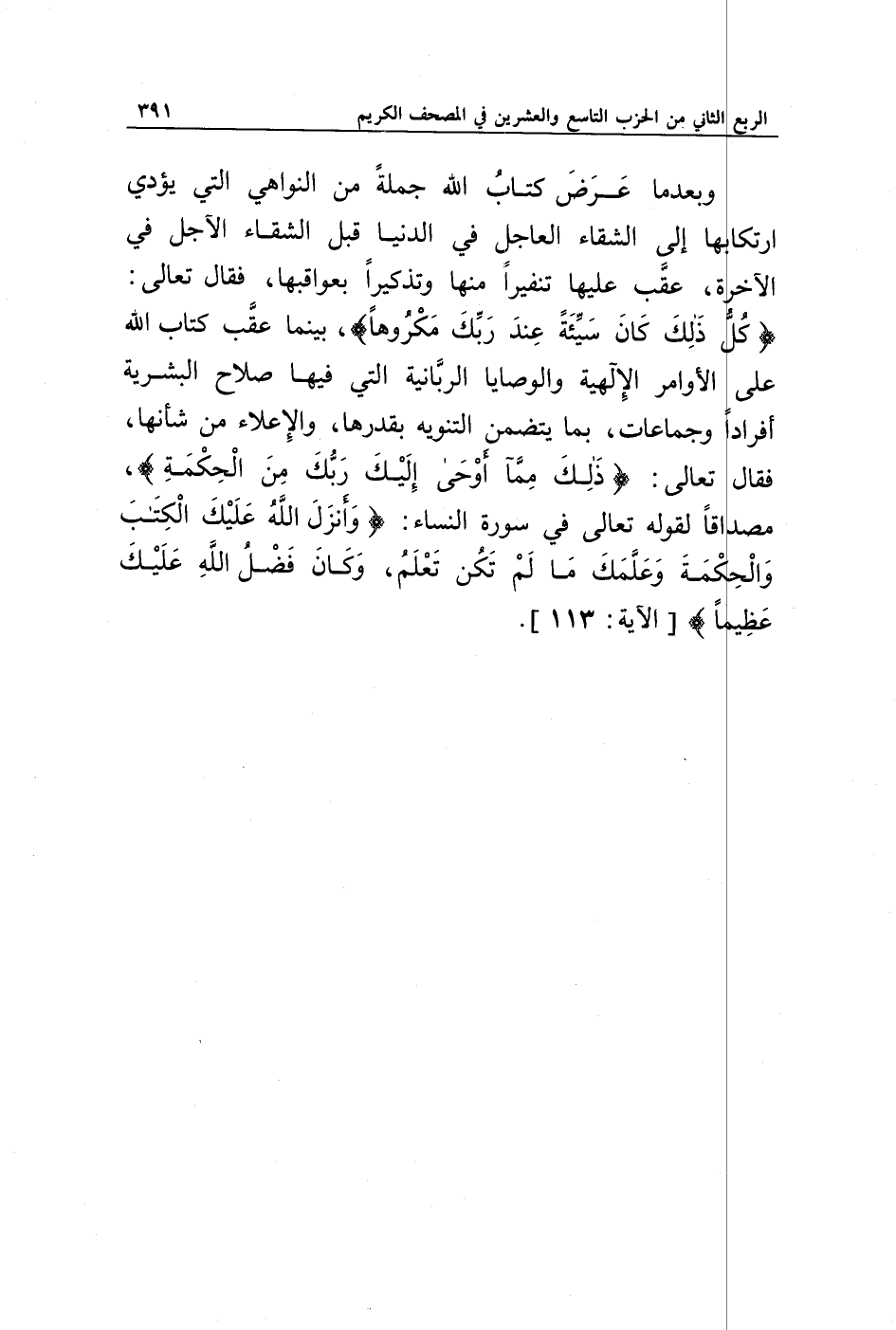 وبعدما عرض كتاب الله جملة من النواهي التي يؤدي ارتكابها إلى الشقاء العاجل في الدنيا قبل الشقاء الآجل في الآخرة، عقب عليها تنفيرا منها وتذكيرا بعواقبها، فقال تعالى: {كُلُّ ذَلِكَ كَانَ سَيِّئُهُ عِنْدَ رَبِّكَ مَكْرُوهًا}،بينما عقب كتاب الله على الأوامر الإلهية والوصايا الربانية التي فيها صلاح البشرية أفرادا وجماعات، بما يتضمن التنويه بقدرها، والإعلاء من شأنها، فقال تعالى: {ذَلِكَ مِمَّا أَوْحَى إِلَيْكَ رَبُّكَ مِنَ الْحِكْمَةِ}، مصداقا لقوله تعالى في سورة النساء: {وَأَنْزَلَ اللَّهُ عَلَيْكَ الْكِتَابَ وَالْحِكْمَةَ وَعَلَّمَكَ مَا لَمْ تَكُنْ تَعْلَمُ وَكَانَ فَضْلُ اللَّهِ عَلَيْكَ عَظِيمًا} [الآية: 113].