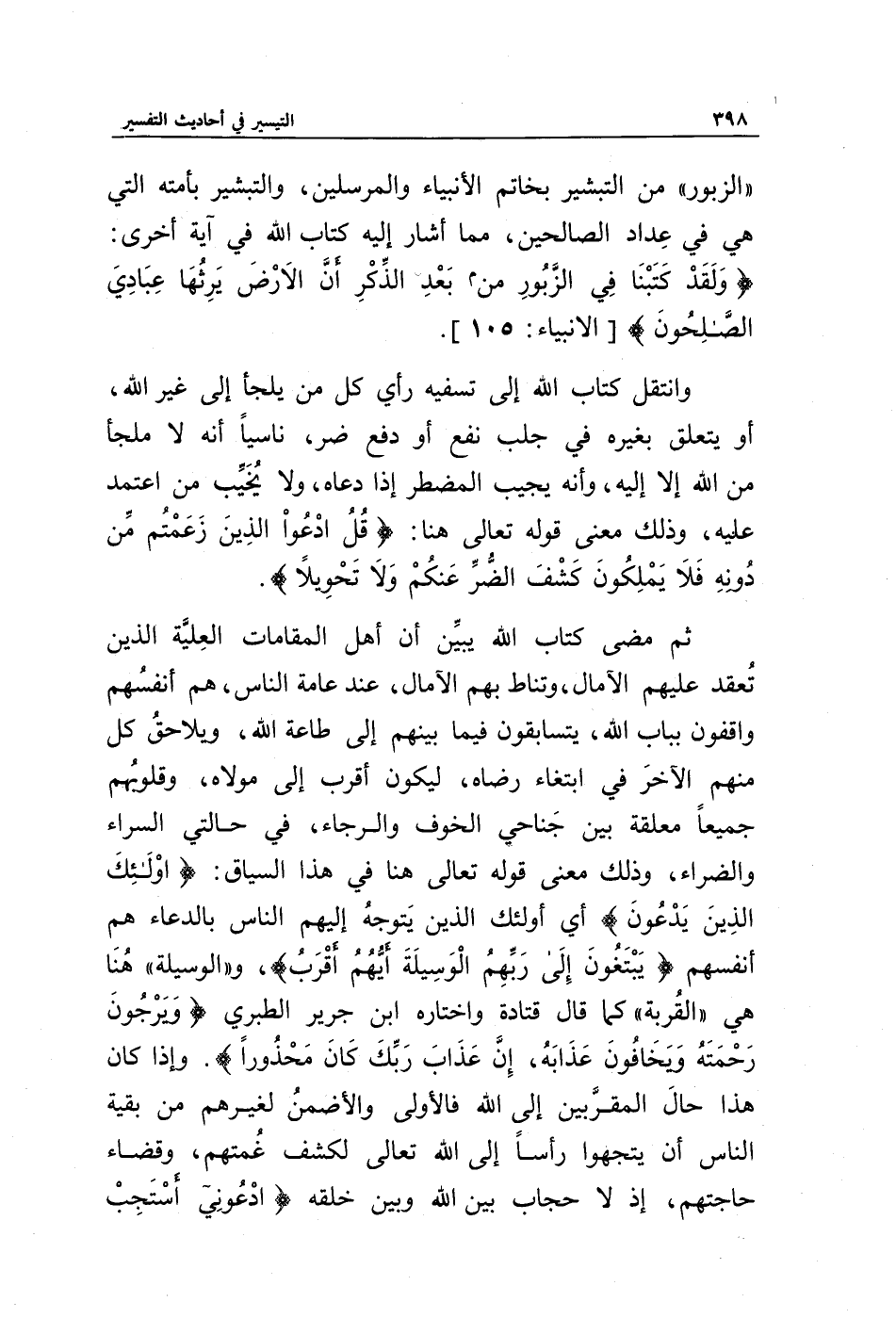 ثم مضى كتاب الله يبين أن أهل المقامات العلية الذين تعقد عليهم الآمال، وتناط بهم الآمال، عند عامة الناس، هم أنفسهم واقفون بباب الله، يتسابقون فيما بينهم إلى طاعة الله، ويلاحق كل منهم الآخر في ابتغاء رضاه، ليكون أقرب إلى مولاه، وقلوبهم جميعا معلقة بين جناحي الخوف والرجاء، في حالتي السراء والضراء، وذلك معنى قوله تعالى هنا في هذا السياق: {أُولَئِكَ الَّذِينَ يَدْعُونَ} أي أولئك الذين يتوجه اليهم الناس بالدعاء هم أنفسهم {يَبْتَغُونَ إِلَى رَبِّهِمُ الْوَسِيلَةَ أَيُّهُمْ أَقْرَبُ}، و " الوسيلة " هنا هي " القربة " كما قال قتادة، واختاره ابن جرير الطبري {وَيَرْجُونَ رَحْمَتَهُ وَيَخَافُونَ عَذَابَهُ إِنَّ عَذَابَ رَبِّكَ كَانَ مَحْذُورًا}. وإذا كان هذا حال المقربين إلى الله فالأولى والأضمن لغيرهم من بقية الناس أن يتجهوا رأسا إلى الله تعالى لكشف غمتهم، وقضاء حاجتهم، إذ لا حجاب بين الله وبين خلقه {ادْعُونِي أَسْتَجِبْ