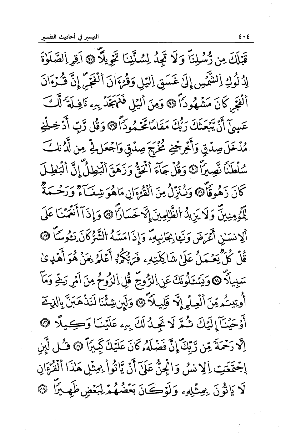 قَبْلَكَ مِنْ رُسُلِنَا وَلَا تَجِدُ لِسُنَّتِنَا تَحْوِيلًا (77) أَقِمِ الصَّلَاةَ لِدُلُوكِ الشَّمْسِ إِلَى غَسَقِ اللَّيْلِ وَقُرْآنَ الْفَجْرِ إِنَّ قُرْآنَ الْفَجْرِ كَانَ مَشْهُودًا (78) وَمِنَ اللَّيْلِ فَتَهَجَّدْ بِهِ نَافِلَةً لَكَ عَسَى أَنْ يَبْعَثَكَ رَبُّكَ مَقَامًا مَحْمُودًا (79) وَقُلْ رَبِّ أَدْخِلْنِي مُدْخَلَ صِدْقٍ وَأَخْرِجْنِي مُخْرَجَ صِدْقٍ وَاجْعَلْ لِي مِنْ لَدُنْكَ سُلْطَانًا نَصِيرًا (80) وَقُلْ جَاءَ الْحَقُّ وَزَهَقَ الْبَاطِلُ إِنَّ الْبَاطِلَ كَانَ زَهُوقًا (81) وَنُنَزِّلُ مِنَ الْقُرْآنِ مَا هُوَ شِفَاءٌ وَرَحْمَةٌ لِلْمُؤْمِنِينَ وَلَا يَزِيدُ الظَّالِمِينَ إِلَّا خَسَارًا (82) وَإِذَا أَنْعَمْنَا عَلَى الْإِنْسَانِ أَعْرَضَ وَنَأَى بِجَانِبِهِ وَإِذَا مَسَّهُ الشَّرُّ كَانَ يَئُوسًا (83) قُلْ كُلٌّ يَعْمَلُ عَلَى شَاكِلَتِهِ فَرَبُّكُمْ أَعْلَمُ بِمَنْ هُوَ أَهْدَى سَبِيلًا (84) وَيَسْأَلُونَكَ عَنِ الرُّوحِ قُلِ الرُّوحُ مِنْ أَمْرِ رَبِّي وَمَا أُوتِيتُمْ مِنَ الْعِلْمِ إِلَّا قَلِيلًا (85) وَلَئِنْ شِئْنَا لَنَذْهَبَنَّ بِالَّذِي أَوْحَيْنَا إِلَيْكَ ثُمَّ لَا تَجِدُ لَكَ بِهِ عَلَيْنَا وَكِيلًا (86) إِلَّا رَحْمَةً مِنْ رَبِّكَ إِنَّ فَضْلَهُ كَانَ عَلَيْكَ كَبِيرًا (87) قُلْ لَئِنِ اجْتَمَعَتِ الْإِنْسُ وَالْجِنُّ عَلَى أَنْ يَأْتُوا بِمِثْلِ هَذَا الْقُرْآنِ لَا يَأْتُونَ بِمِثْلِهِ وَلَوْ كَانَ بَعْضُهُمْ لِبَعْضٍ ظَهِيرًا (88)