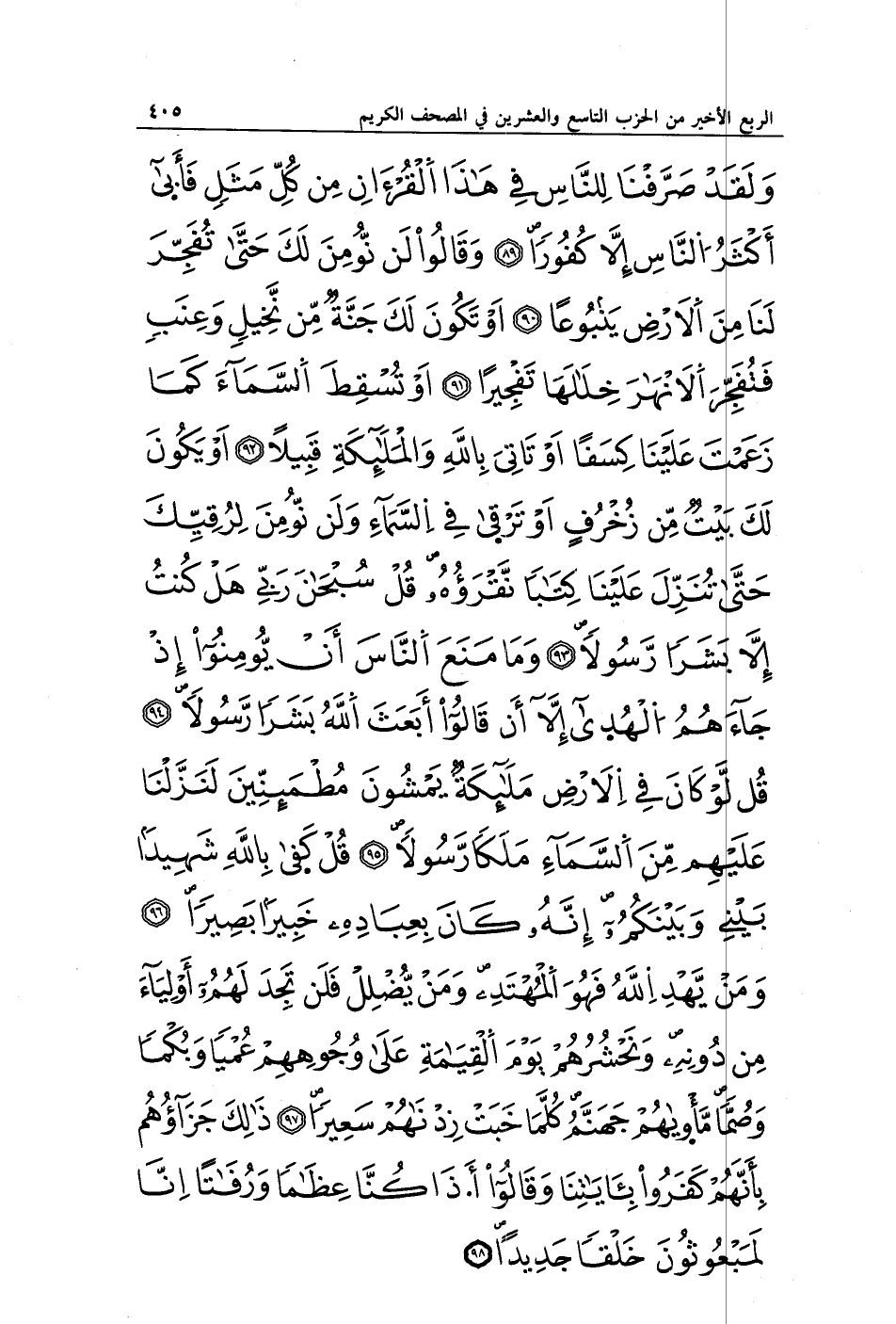 وَلَقَدْ صَرَّفْنَا لِلنَّاسِ فِي هَذَا الْقُرْآنِ مِنْ كُلِّ مَثَلٍ فَأَبَى أَكْثَرُ النَّاسِ إِلَّا كُفُورًا (89) وَقَالُوا لَنْ نُؤْمِنَ لَكَ حَتَّى تَفْجُرَ لَنَا مِنَ الْأَرْضِ يَنْبُوعًا (90) أَوْ تَكُونَ لَكَ جَنَّةٌ مِنْ نَخِيلٍ وَعِنَبٍ فَتُفَجِّرَ الْأَنْهَارَ خِلَالَهَا تَفْجِيرًا (91) أَوْ تُسْقِطَ السَّمَاءَ كَمَا زَعَمْتَ عَلَيْنَا كِسَفًا أَوْ تَأْتِيَ بِاللَّهِ وَالْمَلَائِكَةِ قَبِيلًا (92) أَوْ يَكُونَ لَكَ بَيْتٌ مِنْ زُخْرُفٍ أَوْ تَرْقَى فِي السَّمَاءِ وَلَنْ نُؤْمِنَ لِرُقِيِّكَ حَتَّى تُنَزِّلَ عَلَيْنَا كِتَابًا نَقْرَؤُهُ قُلْ سُبْحَانَ رَبِّي هَلْ كُنْتُ إِلَّا بَشَرًا رَسُولًا (93) وَمَا مَنَعَ النَّاسَ أَنْ يُؤْمِنُوا إِذْ جَاءَهُمُ الْهُدَى إِلَّا أَنْ قَالُوا أَبَعَثَ اللَّهُ بَشَرًا رَسُولًا (94) قُلْ لَوْ كَانَ فِي الْأَرْضِ مَلَائِكَةٌ يَمْشُونَ مُطْمَئِنِّينَ لَنَزَّلْنَا عَلَيْهِمْ مِنَ السَّمَاءِ مَلَكًا رَسُولًا (95) قُلْ كَفَى بِاللَّهِ شَهِيدًا بَيْنِي وَبَيْنَكُمْ إِنَّهُ كَانَ بِعِبَادِهِ خَبِيرًا بَصِيرًا (96) وَمَنْ يَهْدِ اللَّهُ فَهُوَ الْمُهْتَدِ وَمَنْ يُضْلِلْ فَلَنْ تَجِدَ لَهُمْ أَوْلِيَاءَ مِنْ دُونِهِ وَنَحْشُرُهُمْ يَوْمَ الْقِيَامَةِ عَلَى وُجُوهِهِمْ عُمْيًا وَبُكْمًا وَصُمًّا مَأْوَاهُمْ جَهَنَّمُ كُلَّمَا خَبَتْ زِدْنَاهُمْ سَعِيرًا (97) ذَلِكَ جَزَاؤُهُمْ بِأَنَّهُمْ كَفَرُوا بِآيَاتِنَا وَقَالُوا أَإِذَا كُنَّا عِظَامًا وَرُفَاتًا أَإِنَّا لَمَبْعُوثُونَ خَلْقًا جَدِيدًا (98)