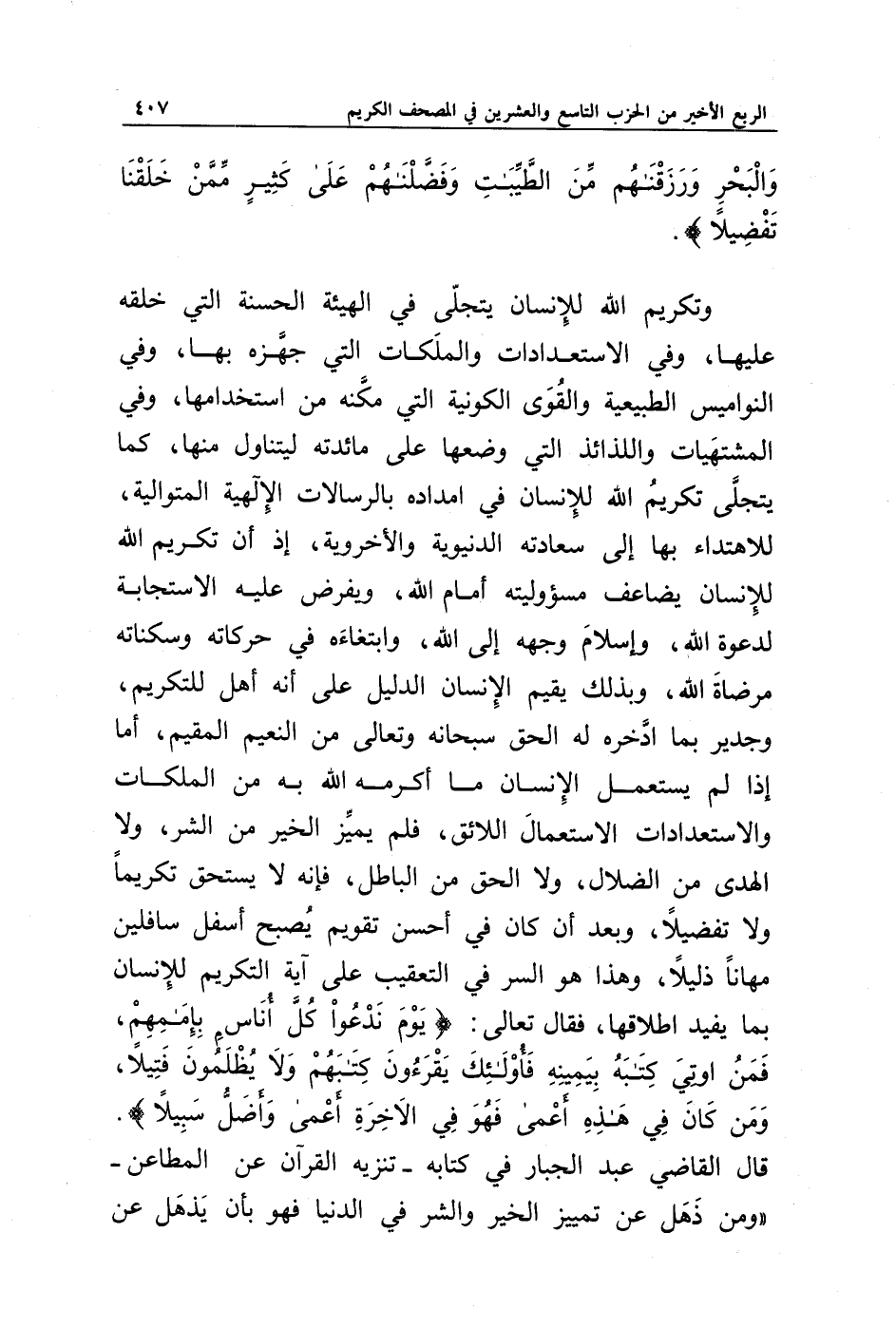 وتكريم الله للإنسان يتجلى في الهيئة الحسنة التي خلقه عليها، وفي الاستعدادات والملكات التي جهزه بها، وفي المشتهيات واللذائذ التي وضعها على مائدته ليتناول منها، كما يتجلى تكريم الله للإنسان في إمداده بالرسالات الإلهية المتوالية، للاهتداء بها إلى سعادته الدنيوية والأخروية، ويفرض عليه الاستجابة لدعوة الله، وإسلام وجهه إلى الله، وابتغاءه في حركاته وسكناته مرضاة الله، وبذلك يقيم الإنسان الدليل على أنه أهل للتكريم، وجدير بما ادخره له الحق سبحانه وتعالى من النعيم المقيم، أما إذا لم يستعمل الإنسان ما أكرمه الله به من الملكات والاستعدادات الاستعمال اللائق، فلم يميز الخير من الشر، ولا الهدى من الضلال، ولا الحق من الباطل، فإنه لا يستحق تكريما ولا تفضيلا، وبعد أن كان في أحسن تقويم يصبح أسفل سافلين مهانا ذليلا، وهذا هو السر في التعقيب على آية التكريم للإنسان، بما يفيد إطلاقها، فقال تعالى: {يَوْمَ نَدْعُو كُلَّ أُنَاسٍ بِإِمَامِهِمْ فَمَنْ أُوتِيَ كِتَابَهُ بِيَمِينِهِ فَأُولَئِكَ يَقْرَءُونَ كِتَابَهُمْ وَلَا يُظْلَمُونَ فَتِيلًا * وَمَنْ كَانَ فِي هَذِهِ أَعْمَى فَهُوَ فِي الْآخِرَةِ أَعْمَى وَأَضَلُّ سَبِيلًا}. قال القاضي عبد الجبار في كتابه -تنزيه القرآن عن المطاعن- " ومن ذهل عن تمييز الخير والشر في الدنيا فهو بأن يذهل عن