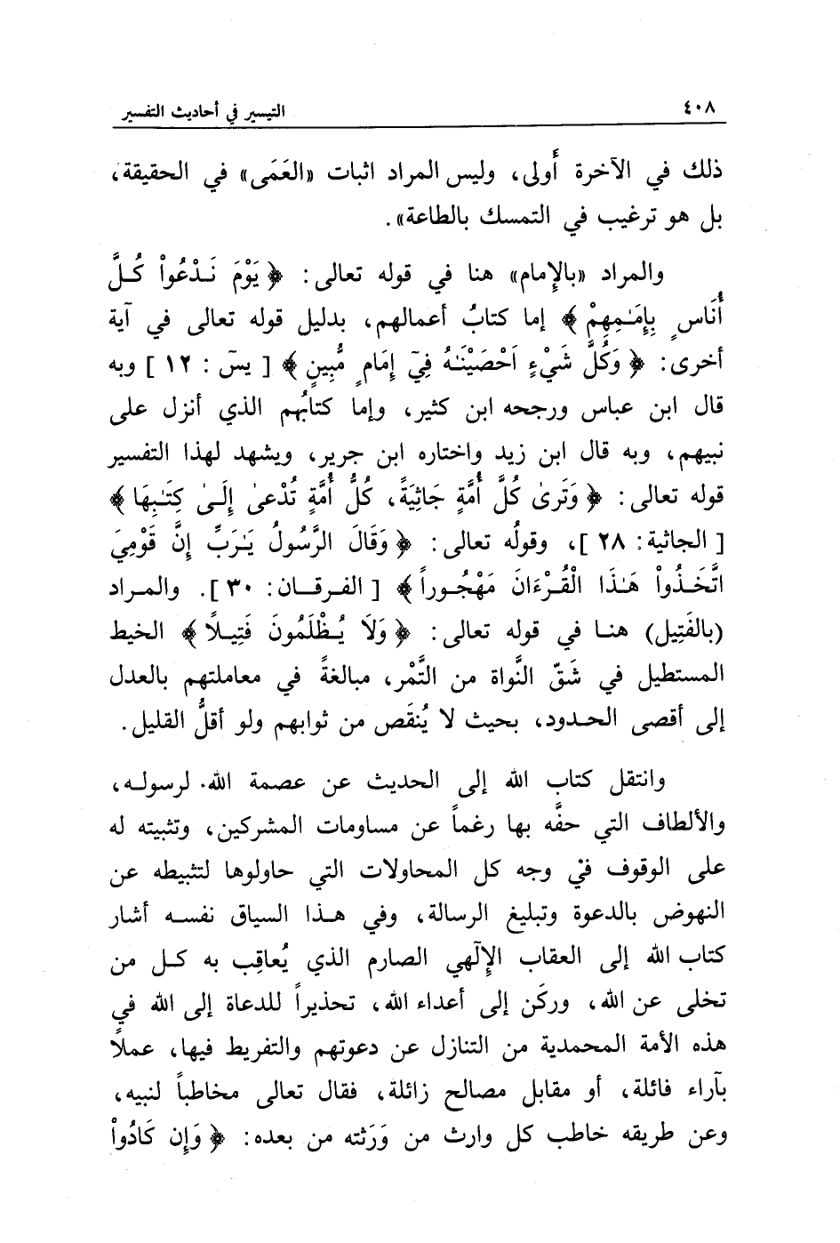 والمراد " بالإمام " هنا في قوله تعالى: {يَوْمَ نَدْعُو كُلَّ أُنَاسٍ بِإِمَامِهِمْ} إما كتاب أعمالهم، بدليل قوله تعالى في آية أخرى: {وَكُلَّ شَيْءٍ أَحْصَيْنَاهُ فِي إِمَامٍ مُبِينٍ} [يس: 12] وبه قال ابن عباس ورجحه ابن كثير، وإما كتابهم الذي أنزل على نبيهم، وبه قال ابن زيد واختاره ابن جرير، ويشهد لهذا التفسير قوله تعالى: {وَتَرَى كُلَّ أُمَّةٍ جَاثِيَةً كُلُّ أُمَّةٍ تُدْعَى إِلَى كِتَابِهَا} [الجاثية: 28]، وقوله تعالى: {وَقَالَ الرَّسُولُ يَا رَبِّ إِنَّ قَوْمِي اتَّخَذُوا هَذَا الْقُرْآنَ مَهْجُورًا} [الفرقان: 30]. والمراد (بالفتيل) هنا في قوله تعالى: {وَلَا يُظْلَمُونَ فَتِيلًا} الخيط المستطيل في شق النواة من التمر، مبالغة في معاملتهم بالعدل إلى أقصى الحدود، بحيث لا ينقص من ثوابهم ولو أقل القليل.