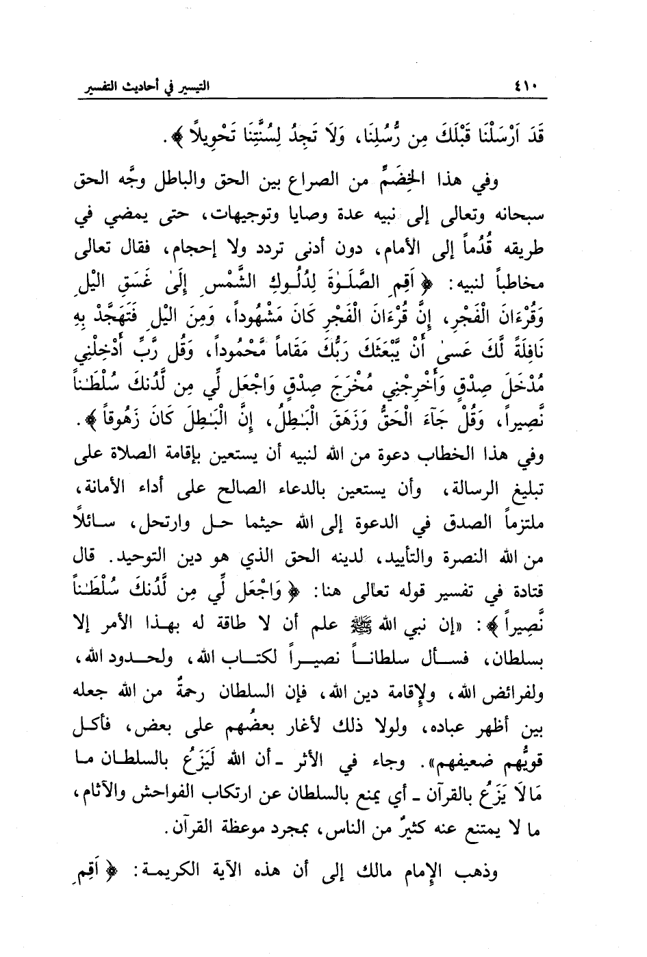 وفي هذا الخضم من الصراع بين الحق والباطل وجه الحق سبحانه وتعالى إلى نبيه عدة وصايا وتوجيهات، حتى يمضي في طريقه قدما إلى الأمام، دون أدنى تردد ولا إحجام، فقال تعالى مخاطبا لنبيه: {أَقِمِ الصَّلَاةَ لِدُلُوكِ الشَّمْسِ إِلَى غَسَقِ اللَّيْلِ وَقُرْآنَ الْفَجْرِ إِنَّ قُرْآنَ الْفَجْرِ كَانَ مَشْهُودًا * وَمِنَ اللَّيْلِ فَتَهَجَّدْ بِهِ نَافِلَةً لَكَ عَسَى أَنْ يَبْعَثَكَ رَبُّكَ مَقَامًا مَحْمُودًا * وَقُلْ رَبِّ أَدْخِلْنِي مُدْخَلَ صِدْقٍ وَأَخْرِجْنِي مُخْرَجَ صِدْقٍ وَاجْعَلْ لِي مِنْ لَدُنْكَ سُلْطَانًا نَصِيرًا * وَقُلْ جَاءَ الْحَقُّ وَزَهَقَ الْبَاطِلُ إِنَّ الْبَاطِلَ كَانَ زَهُوقًا}. وفي هذا الخطاب دعوة من الله لنبيه أن يستعين بإقامة الصلاة على تبليغ الرسالة، وأن يستعين بالدعاء الصالح على أداء الأمانة، ملتزما الصدق في الدعوة إلى الله حيثما حل وارتحل، سائلا من الله النصرة والتأييد، لدينه الحق الذي هو دين التوحيد. قال قتادة في تفسير قوله تعالى هنا: {وَاجْعَلْ لِي مِنْ لَدُنْكَ سُلْطَانًا نَصِيرًا}: " إن نبي الله صلى الله عليه وسلم علم أن لا طاقة له بهذا الأمر إلا بسلطان، فسأل سلطانا نصيرا لكتاب الله، ولحدود الله، ولفرائض الله، ولإقامة دين الله، فإن السلطان رحمة من الله جعله بين أظهر عباده، ولولا ذلك لأغار بعضهم على بعض، فأكل قويهم ضعيفهم ". وجاء في الأثر -أن الله ليزع بالسلطان ما لا يزع بالقرآن- أي يمنع بالسلطان عن ارتكاب الفواحش والآثام، ما لا يمتنع عنه كثير من الناس، بمجرد موعظة القرآن.
