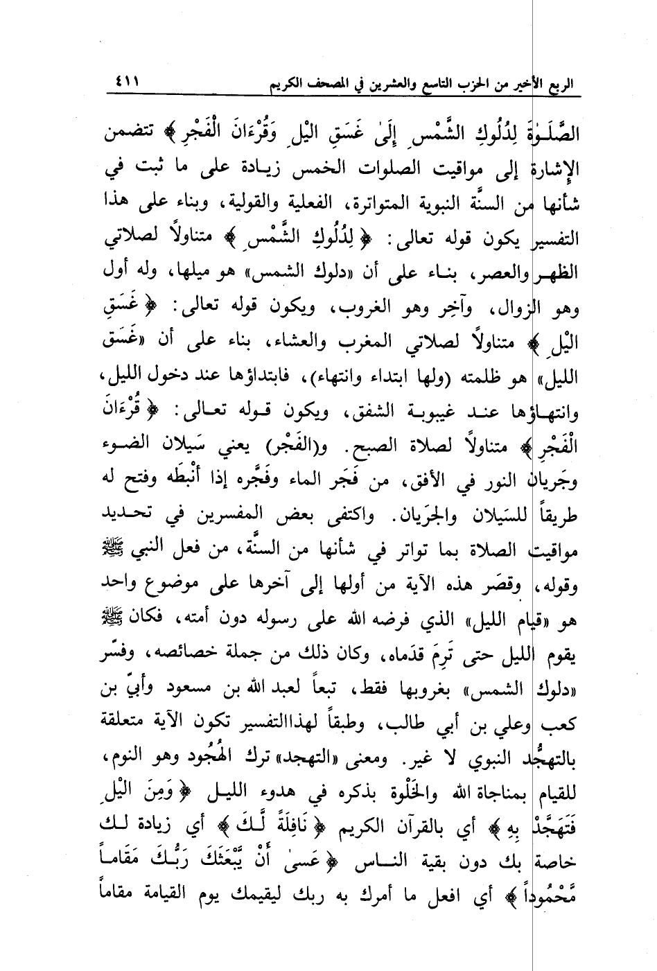 الصَّلَاةَ لِدُلُوكِ الشَّمْسِ إِلَى غَسَقِ اللَّيْلِ وَقُرْآنَ الْفَجْرِ} تتضمن الإشارة إلى مواقيت الصلوات الخمس زيادة على ما ثبت في شأنها من السنة النبوية المتواترة، الفعلية والقولية، وبناء على هذا التفسير يكون قوله تعالى: {لِدُلُوكِ الشَّمْسِ} متناولا لصلاتي الظهر والعصر، بناء على أن " دلوك الشمس " هو ميلها، وله أول وهو الزوال، وآخر وهو الغروب، ويكون قوله تعالى: {غَسَقِ اللَّيْلِ} متناولا لصلاتي المغرب والعشاء، بناء على أن " غسق الليل " هو ظلمته (ولها ابتداء وانتهاء)، فابتداؤها عند دخول الليل، وانتهاؤها عند غيبوبة الشفق، ويكون قوله تعالى: {قُرْآنَ الْفَجْرِ} متناولا لصلاة الصبح. و {الْفَجْرِ} يعني سيلان الضوء وجريان النور في الأفق، من فجر الماء وفجره إذا أنبطه وفتح له طريقا للسيلان والجريان. واكتفى بعض المفسرين في تحديد مواقيت الصلاة بما تواتر في شأنها من السنة، من فعل النبي صلى الله عليه وسلم وقوله، وقصر هذه الآية من أولها إلى آخرها على موضوع واحد هو " قيام الليل " الذي فرضه الله على رسوله دون أمته، فكان صلى الله عليه وسلم يقوم الليل حتى ترم قدماه، وكان ذلك من جملة خصائصه، وفسر " دلوك الشمس " بغروبها فقط، تبعا لعبد الله بن مسعود وأبي بن كعب وعلي بن أبي طالب، وطبقا لهذا التفسير تكون الآية متعلقة بالتهجد النبوي لا غير. ومعنى " التهجد " ترك الهجود وهو النوم، للقيام بمناجاة الله والخلوة بذكره في هدوء الليل {وَمِنَ اللَّيْلِ فَتَهَجَّدْ بِهِ} أي بالقرآن الكريم {نَافِلَةً لَكَ} أي زيادة لك خاصة بك دون بقية الناس {عَسَى أَنْ يَبْعَثَكَ رَبُّكَ مَقَامًا مَحْمُودًا} أي افعل ما أمرك به ربك ليقيمك يوم القيامة مقاما