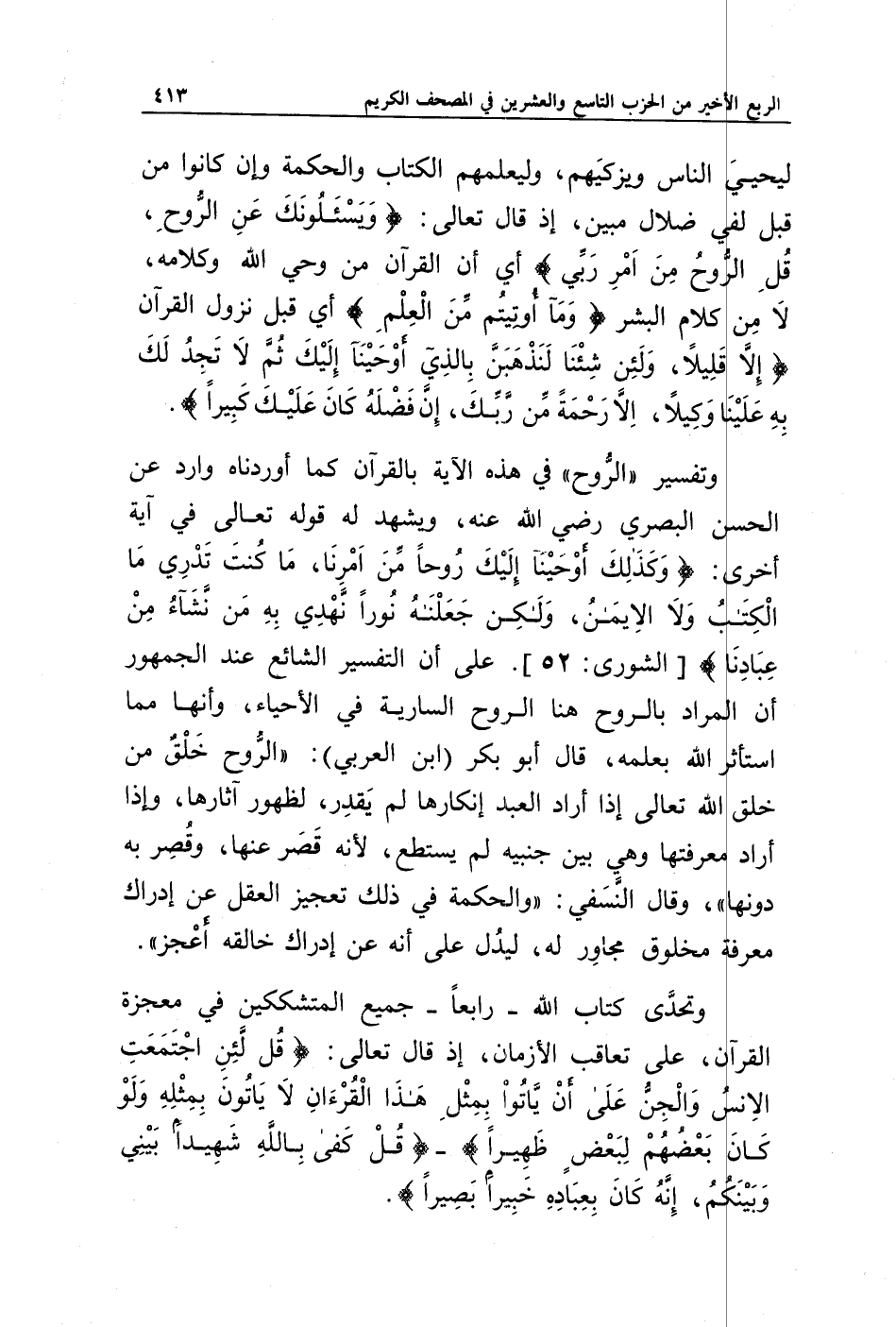 وتفسير " الروح " في هذه الآية بالقرآن كما أوردناه وارد عن الحسن البصري رضي الله عنه، ويشهد له قوله تعالى في آية أخرى: {وَكَذَلِكَ أَوْحَيْنَا إِلَيْكَ رُوحًا مِنْ أَمْرِنَا مَا كُنْتَ تَدْرِي مَا الْكِتَابُ وَلَا الْإِيمَانُ وَلَكِنْ جَعَلْنَاهُ نُورًا نَهْدِي بِهِ مَنْ نَشَاءُ مِنْ عِبَادِنَا} [الشورى: 52]. على أن التفسير الشائع عند الجمهور أن المراد بالروح هنا الروح السارية في الأحياء، وأنها مما استأثر الله بعلمه، قال أبو بكر (ابن العربي): " الروح خلق من خلق الله تعالى إذا أراد العبد إنكارها لم يقدر، لظهور آثارها، وإذا أراد معرفتها وهي بين جنبيه لم يستطع، لأنه قصر عنها، وقصر به دونها "، وقال النسفي: " والحكمة في ذلك تعجيز العقل عن إدراك معرفة مخلوق مجاور له، ليدل على أنه عن إدراك خالقه أعجز ".