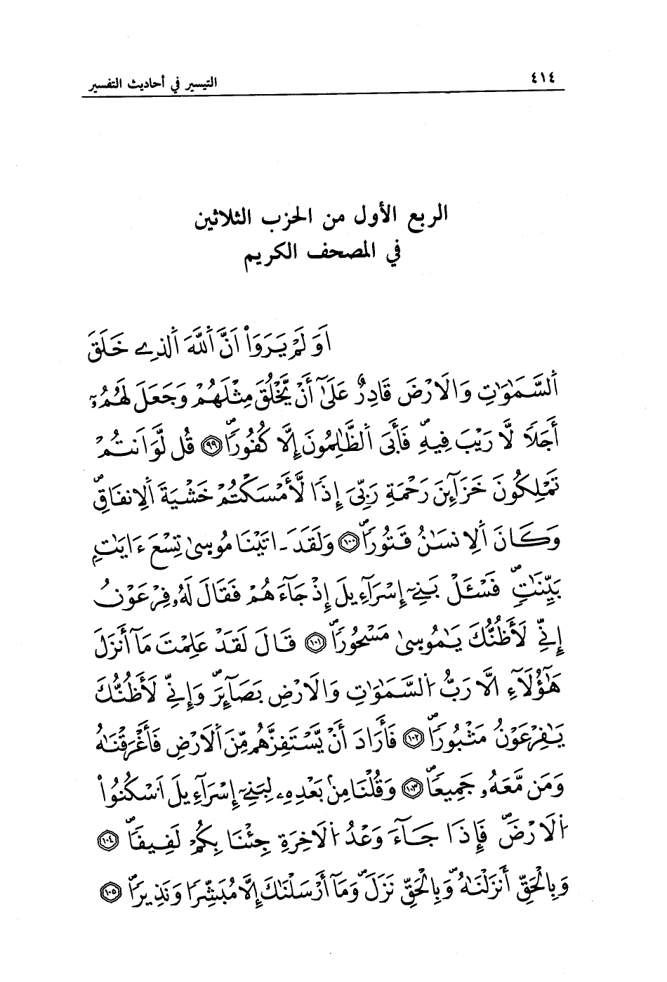 أَوَلَمْ يَرَوْا أَنَّ اللَّهَ الَّذِي خَلَقَ السَّمَاوَاتِ وَالْأَرْضَ قَادِرٌ عَلَى أَنْ يَخْلُقَ مِثْلَهُمْ وَجَعَلَ لَهُمْ أَجَلًا لَا رَيْبَ فِيهِ فَأَبَى الظَّالِمُونَ إِلَّا كُفُورًا (99) قُلْ لَوْ أَنْتُمْ تَمْلِكُونَ خَزَائِنَ رَحْمَةِ رَبِّي إِذًا لَأَمْسَكْتُمْ خَشْيَةَ الْإِنْفَاقِ وَكَانَ الْإِنْسَانُ قَتُورًا (100) وَلَقَدْ آتَيْنَا مُوسَى تِسْعَ آيَاتٍ بَيِّنَاتٍ فَاسْأَلْ بَنِي إِسْرَائِيلَ إِذْ جَاءَهُمْ فَقَالَ لَهُ فِرْعَوْنُ إِنِّي لَأَظُنُّكَ يَا مُوسَى مَسْحُورًا (101) قَالَ لَقَدْ عَلِمْتَ مَا أَنْزَلَ هَؤُلَاءِ إِلَّا رَبُّ السَّمَاوَاتِ وَالْأَرْضِ بَصَائِرَ وَإِنِّي لَأَظُنُّكَ يَا فِرْعَوْنُ مَثْبُورًا (102) فَأَرَادَ أَنْ يَسْتَفِزَّهُمْ مِنَ الْأَرْضِ فَأَغْرَقْنَاهُ وَمَنْ مَعَهُ جَمِيعًا (103) وَقُلْنَا مِنْ بَعْدِهِ لِبَنِي إِسْرَائِيلَ اسْكُنُوا الْأَرْضَ فَإِذَا جَاءَ وَعْدُ الْآخِرَةِ جِئْنَا بِكُمْ لَفِيفًا (104) وَبِالْحَقِّ أَنْزَلْنَاهُ وَبِالْحَقِّ نَزَلَ وَمَا أَرْسَلْنَاكَ إِلَّا مُبَشِّرًا وَنَذِيرًا (105)