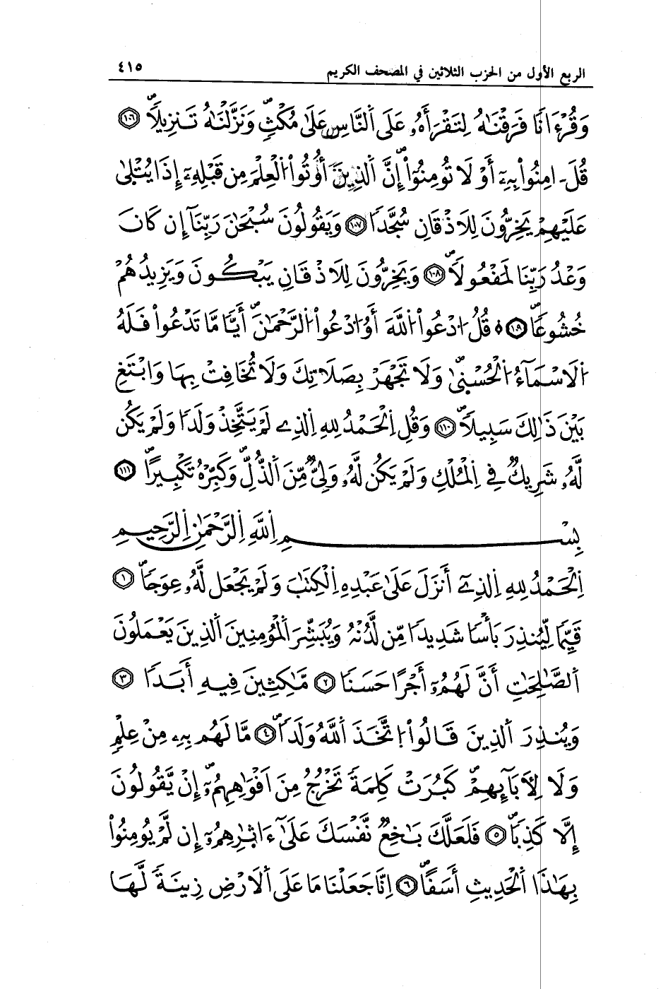 الْحَمْدُ لِلَّهِ الَّذِي أَنْزَلَ عَلَى عَبْدِهِ الْكِتَابَ وَلَمْ يَجْعَلْ لَهُ عِوَجًا (1) قَيِّمًا لِيُنْذِرَ بَأْسًا شَدِيدًا مِنْ لَدُنْهُ وَيُبَشِّرَ الْمُؤْمِنِينَ الَّذِينَ يَعْمَلُونَ الصَّالِحَاتِ أَنَّ لَهُمْ أَجْرًا حَسَنًا (2) مَاكِثِينَ فِيهِ أَبَدًا (3) وَيُنْذِرَ الَّذِينَ قَالُوا اتَّخَذَ اللَّهُ وَلَدًا (4) مَا لَهُمْ بِهِ مِنْ عِلْمٍ وَلَا لِآبَائِهِمْ كَبُرَتْ كَلِمَةً تَخْرُجُ مِنْ أَفْوَاهِهِمْ إِنْ يَقُولُونَ إِلَّا كَذِبًا (5) فَلَعَلَّكَ بَاخِعٌ نَفْسَكَ عَلَى آثَارِهِمْ إِنْ لَمْ يُؤْمِنُوا بِهَذَا الْحَدِيثِ أَسَفًا (6) إِنَّا جَعَلْنَا مَا عَلَى الْأَرْضِ زِينَةً لَهَا