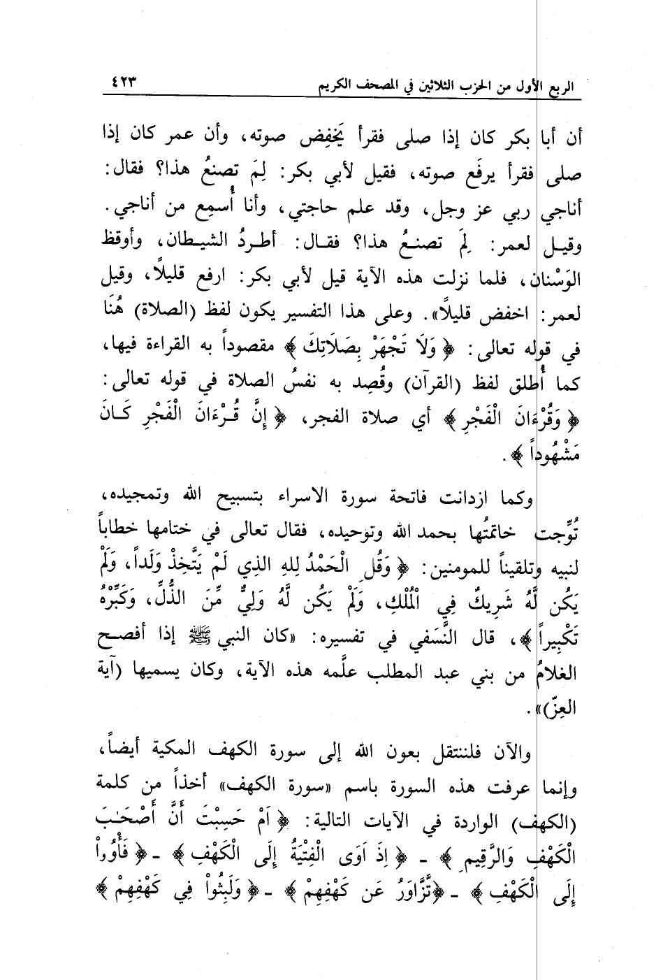 أن أبا بكر كان إذا صلى فقرأ يخفض صوته، وأن عمر كان إذا صلى فقرأ يرفع صوته، فقيل لأبي بكر: لم تصنع هذا؟ فقال: أناجي ربي عز وجل، وقد علم حاجتي، وأنا أسمع من أناجي. وقيل لعمر: لم تصنع هذا؟ فقال: أطرد الشيطان، وأوقظ الوسنان، فلما نزلت هذه الآية قيل لأبي بكر: ارفع قليلا، وقيل لعمر: اخفض قليلا ". وعلى هذا التفسير يكون لفظ (الصلاة) هنا في قوله تعالى: {وَلَا تَجْهَرْ بِصَلَاتِكَ} مقصودا به القراءة فيها، كما أطلق لفظ (القرآن) وقصد به نفس الصلاة في قوله تعالى: {وَقُرْآنَ الْفَجْرِ} أي صلاة الفجر، {إِنَّ قُرْآنَ الْفَجْرِ كَانَ مَشْهُودًا}.