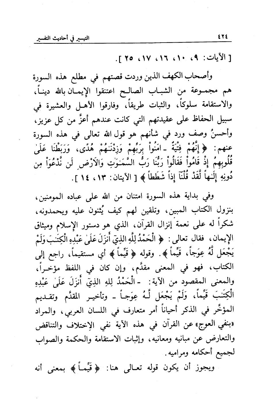 وفي بداية هذه السورة امتنان من الله على عباده المومنين، بنزول الكتاب المبين، وتلقين لهم كيف يثنون عليه ويحمدونه، شكرا له على نعمة إنزال القرآن، الذي هو دستور الإسلام وميثاق الإيمان، فقال تعالى: {الْحَمْدُ لِلَّهِ الَّذِي أَنْزَلَ عَلَى عَبْدِهِ الْكِتَابَ وَلَمْ يَجْعَلْ لَهُ عِوَجَا}. وقوله {قَيِّمًا} أي مستقيما، راجع إلى الكتاب، فهو في المعنى مقدم، وإن كان في اللفظ مؤخرا، والمعنى المقصود من الآية: -الحمد لله الذي أنزل على عبده الكتاب قيما، ولم يجعل له عوجا -وتأخير المقدم وتقديم المؤخر في الذكر أحيانا أمر متعارف في اللسان العربي، والمراد " بنفي العوج " عن القرآن في هذه الآية نفي الاختلاف والتناقض والتعارض عن مبانيه ومعانيه، وإثبات الاستقامة والحكمة والصواب لجميع أحكامه ومراميه.