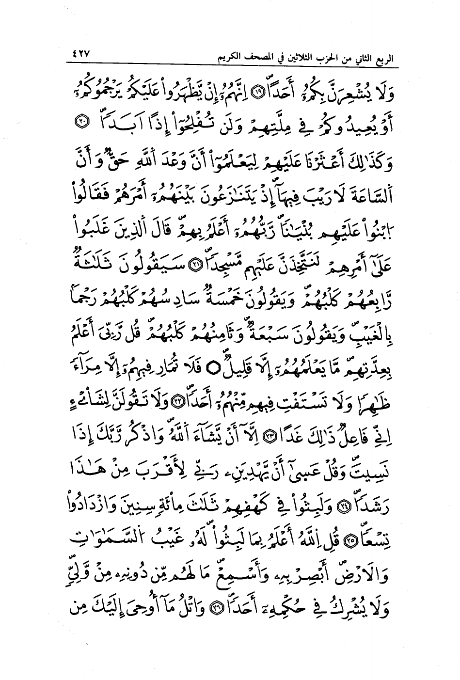 وَلَا يُشْعِرَنَّ بِكُمْ أَحَدًا (19) إِنَّهُمْ إِنْ يَظْهَرُوا عَلَيْكُمْ يَرْجُمُوكُمْ أَوْ يُعِيدُوكُمْ فِي مِلَّتِهِمْ وَلَنْ تُفْلِحُوا إِذًا أَبَدًا (20) وَكَذَلِكَ أَعْثَرْنَا عَلَيْهِمْ لِيَعْلَمُوا أَنَّ وَعْدَ اللَّهِ حَقٌّ وَأَنَّ السَّاعَةَ لَا رَيْبَ فِيهَا إِذْ يَتَنَازَعُونَ بَيْنَهُمْ أَمْرَهُمْ فَقَالُوا ابْنُوا عَلَيْهِمْ بُنْيَانًا رَبُّهُمْ أَعْلَمُ بِهِمْ قَالَ الَّذِينَ غَلَبُوا عَلَى أَمْرِهِمْ لَنَتَّخِذَنَّ عَلَيْهِمْ مَسْجِدًا (21) سَيَقُولُونَ ثَلَاثَةٌ رَابِعُهُمْ كَلْبُهُمْ وَيَقُولُونَ خَمْسَةٌ سَادِسُهُمْ كَلْبُهُمْ رَجْمًا بِالْغَيْبِ وَيَقُولُونَ سَبْعَةٌ وَثَامِنُهُمْ كَلْبُهُمْ قُلْ رَبِّي أَعْلَمُ بِعِدَّتِهِمْ مَا يَعْلَمُهُمْ إِلَّا قَلِيلٌ فَلَا تُمَارِ فِيهِمْ إِلَّا مِرَاءً ظَاهِرًا وَلَا تَسْتَفْتِ فِيهِمْ مِنْهُمْ أَحَدًا (22) وَلَا تَقُولَنَّ لِشَيْءٍ إِنِّي فَاعِلٌ ذَلِكَ غَدًا (23) إِلَّا أَنْ يَشَاءَ اللَّهُ وَاذْكُرْ رَبَّكَ إِذَا نَسِيتَ وَقُلْ عَسَى أَنْ يَهْدِيَنِ رَبِّي لِأَقْرَبَ مِنْ هَذَا رَشَدًا (24) وَلَبِثُوا فِي كَهْفِهِمْ ثَلَاثَ مِائَةٍ سِنِينَ وَازْدَادُوا تِسْعًا (25) قُلِ اللَّهُ أَعْلَمُ بِمَا لَبِثُوا لَهُ غَيْبُ السَّمَاوَاتِ وَالْأَرْضِ أَبْصِرْ بِهِ وَأَسْمِعْ مَا لَهُمْ مِنْ دُونِهِ مِنْ وَلِيٍّ وَلَا يُشْرِكُ فِي حُكْمِهِ أَحَدًا (26) وَاتْلُ مَا أُوحِيَ إِلَيْكَ مِنْ