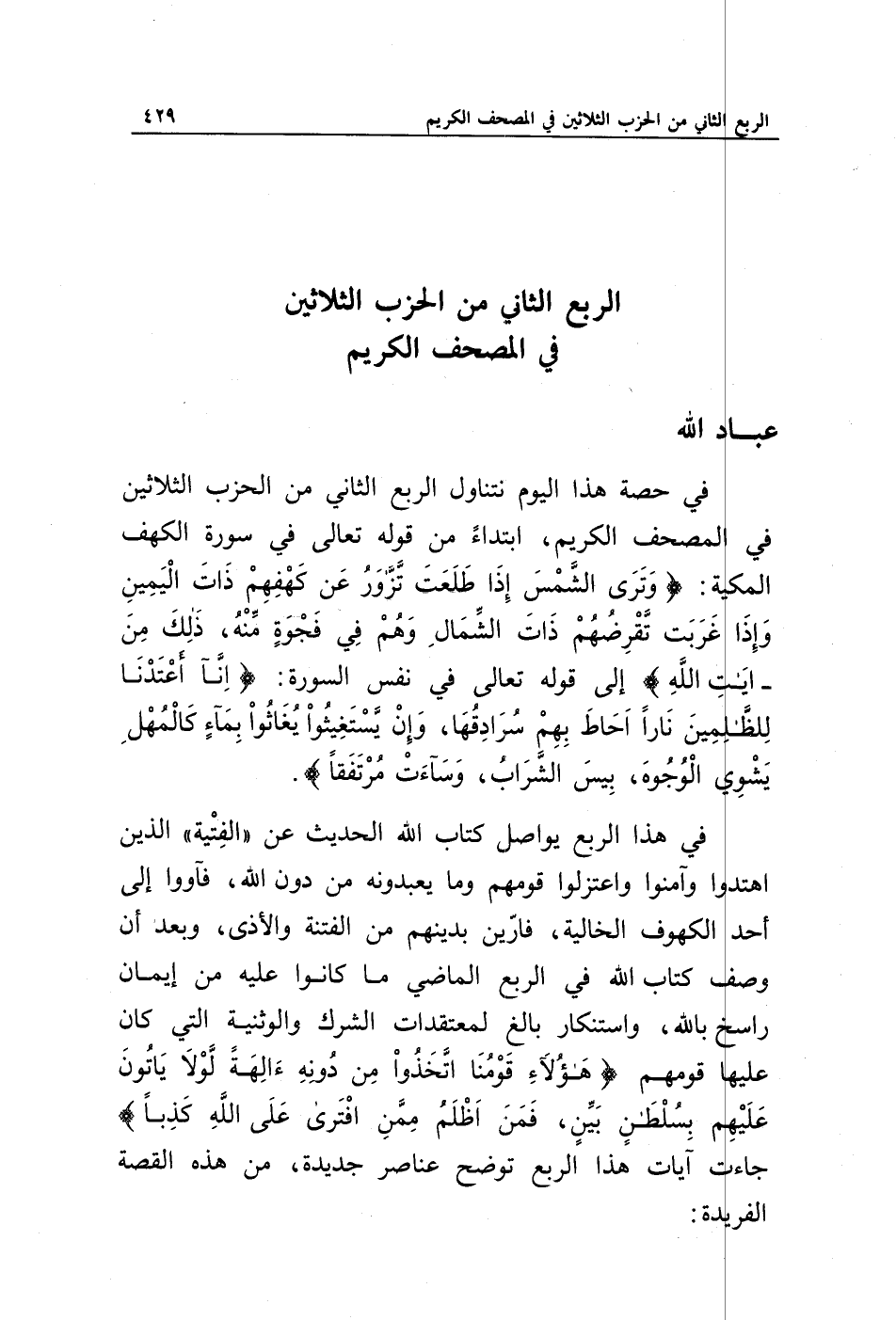 في حصة هذا اليوم نتناول الربع الثاني من الحزب الثلاثين في المصحف الكريم، ابتداء من قوله تعالى في سورة الكهف المكية: {وَتَرَى الشَّمْسَ إِذَا طَلَعَتْ تَزَاوَرُ عَنْ كَهْفِهِمْ ذَاتَ الْيَمِينِ وَإِذَا غَرَبَتْ تَقْرِضُهُمْ ذَاتَ الشِّمَالِ وَهُمْ فِي فَجْوَةٍ مِنْهُ ذَلِكَ مِنْ آيَاتِ اللَّهِ} إلى قوله تعالى في نفس السورة: {إِنَّا أَعْتَدْنَا لِلظَّالِمِينَ نَارًا أَحَاطَ بِهِمْ سُرَادِقُهَا وَإِنْ يَسْتَغِيثُوا يُغَاثُوا بِمَاءٍ كَالْمُهْلِ يَشْوِي الْوُجُوهَ بِئْسَ الشَّرَابُ وَسَاءَتْ مُرْتَفَقًا}.