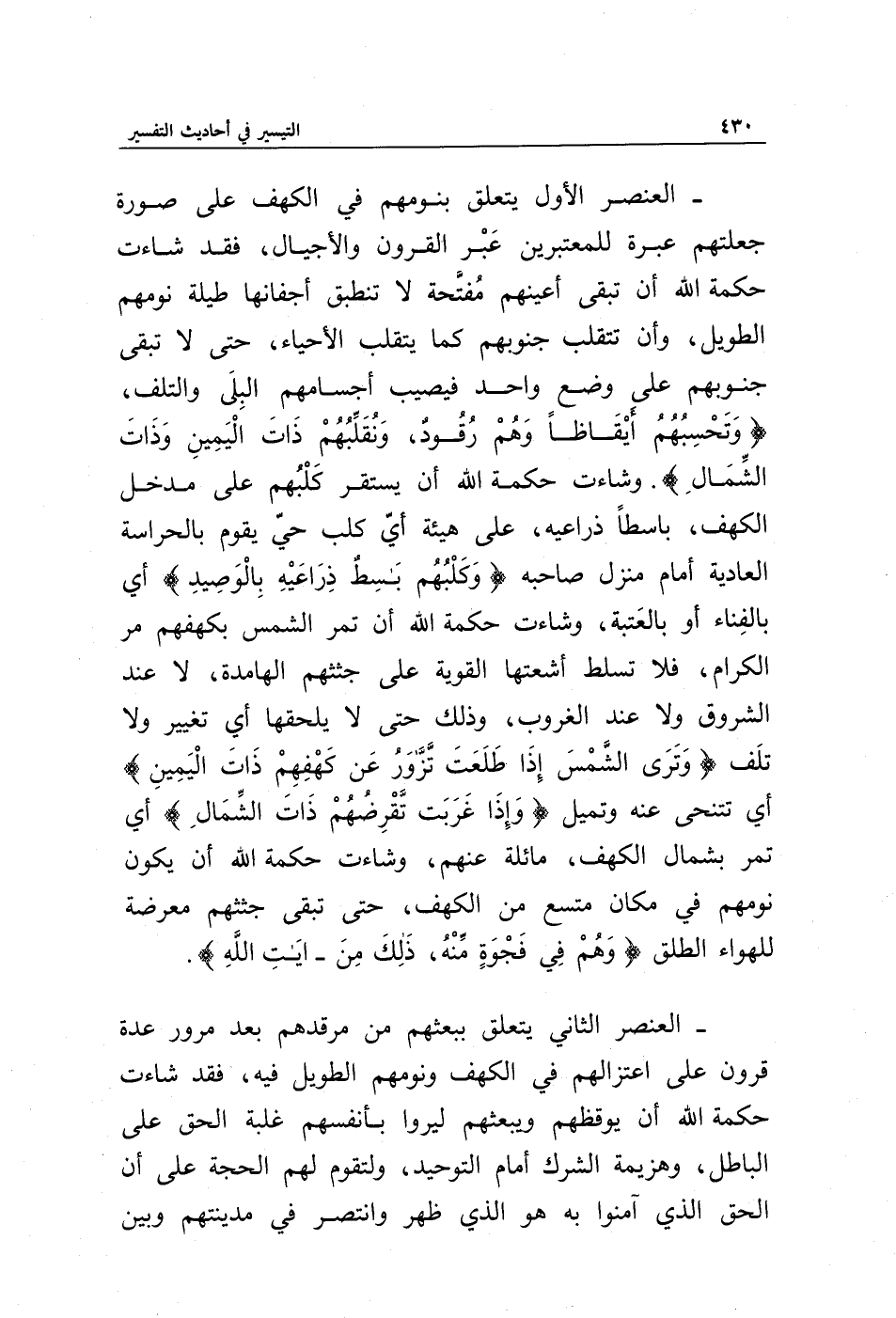 - العنصر الأول يتعلق بنومهم في الكهف على صورة جعلتهم عبرة للمعتبرين عبر القرون والأجيال، فقد شاءت حكمة الله أن تبقى أعينهم مفتحة لا تنطبق أجفانها طيلة نومهم الطويل، وأن تتقلب جنوبهم كما يتقلب الأحياء، حتى لا تبقى جنوبهم على وضع واحد فيصيب أجسامهم البلى والتلف، {وَتَحْسَبُهُمْ أَيْقَاظًا وَهُمْ رُقُودٌ وَنُقَلِّبُهُمْ ذَاتَ الْيَمِينِ وَذَاتَ الشِّمَالِ}. وشاءت حكمة الله أن يستقر كلبهم على مدخل الكهف، باسطا ذراعيه، على هيئة أي كلب حي يقوم بالحراسة العادية أمام منزل صاحبه {وَكَلْبُهُمْ بَاسِطٌ ذِرَاعَيْهِ بِالْوَصِيدِ} أي بالفناء أو العتبة، وشاءت حكمة الله أن تمر الشمس بكهفهم مر الكرام، فلا تسلط أشعتها القوية على جثثهم الهامدة، لا عند الشروق ولا عند الغروب، وذلك حتى لا يلحقها أي تغيير ولا تلف {وَتَرَى الشَّمْسَ إِذَا طَلَعَتْ تَزَاوَرُ عَنْ كَهْفِهِمْ ذَاتَ الْيَمِينِ} أي تتنحى عنه وتميل {وَإِذَا غَرَبَتْ تَقْرِضُهُمْ ذَاتَ الشِّمَالِ} أي تمر بشمال الكهف، مائلة منهم، وشاءت حكمة الله أن يكون نومهم في مكان متسع من الكهف، حتى تبقى جثثهم معرضة للهواء الطلق {وَهُمْ فِي فَجْوَةٍ مِنْهُ ذَلِكَ مِنْ آيَاتِ اللَّهِ}.