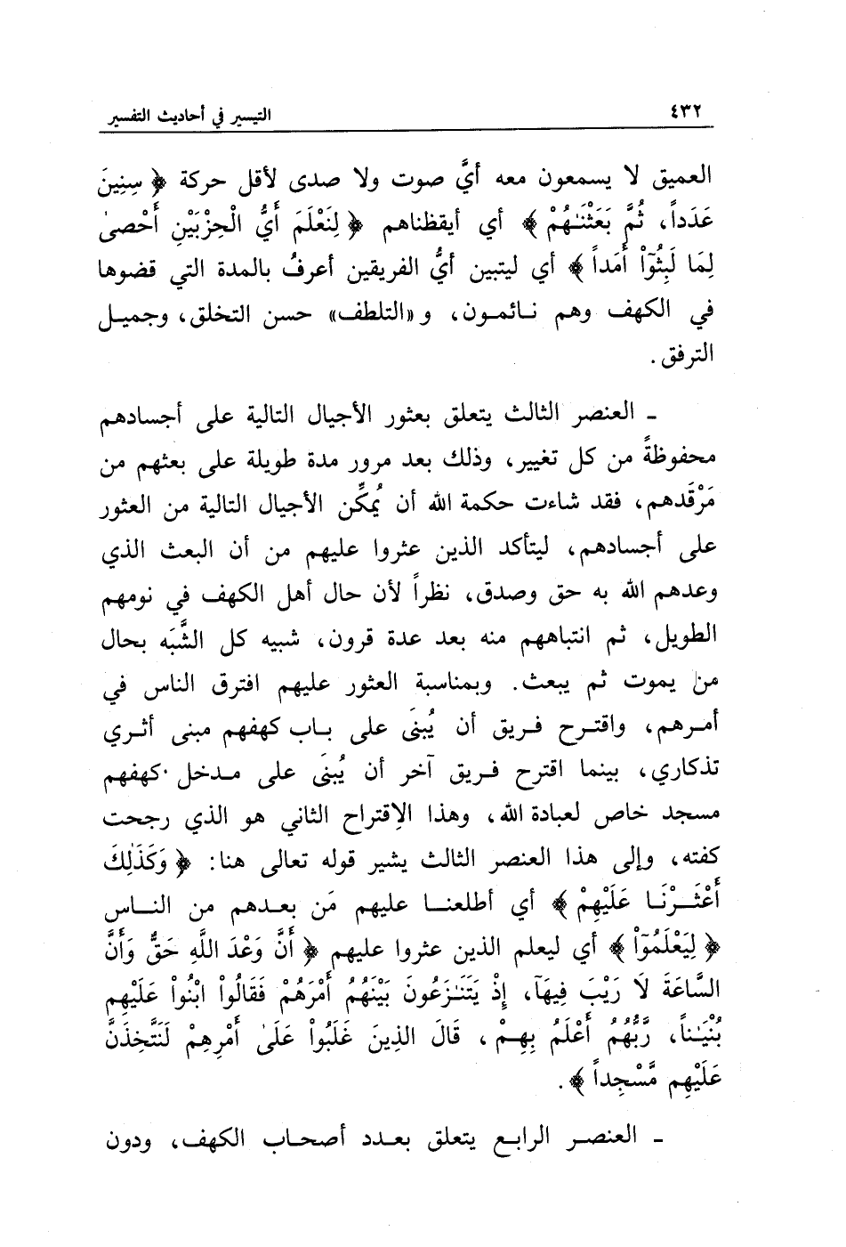 - العنصر الثالث يتعلق بعثور الأجيال التالية على أجسادهم محفوظة من كل تغيير، وذلك بعد مرور مدة طويلة على بعثهم من مرقدهم، فقد شاءت حكمة الله أن يمكن الأجيال التالية من العثور على أجسادهم، ليتأكد الذين عثروا عليهم من أن البعث الذي وعدهم الله به حق وصدق، نظرا لأن حال الكهف في نومهم الطويل، ثم انتباههم منه بعد عدة قرون، شبيه كل الشبه بحال من يموت ثم يبعث. وبمناسبة العثور عليهم افترق الناس في أمرهم، واقترح فريق أن يبنى على باب كهفهم مبنى أثري تذكاري، بينما اقترح آخر أن يبنى على مدخل كهفهم مسجد خاص لعبادة الله، وهذا الاقتراح الثاني هو الذي رجحت كفته، وإلى هذا العنصر الثالث يشير قوله تعالى هنا: {وَكَذَلِكَ أَعْثَرْنَا عَلَيْهِمْ} أي أطلعنا عليهم من بعدهم من الناس {لِيَعْلَمُوا} أي ليعلم الذين عثروا عليهم {أَنَّ وَعْدَ اللَّهِ حَقٌّ وَأَنَّ السَّاعَةَ لَا رَيْبَ فِيهَا إِذْ يَتَنَازَعُونَ بَيْنَهُمْ أَمْرَهُمْ فَقَالُوا ابْنُوا عَلَيْهِمْ بُنْيَانًا رَبُّهُمْ أَعْلَمُ بِهِمْ قَالَ الَّذِينَ غَلَبُوا عَلَى أَمْرِهِمْ لَنَتَّخِذَنَّ عَلَيْهِمْ مَسْجِدًا}.