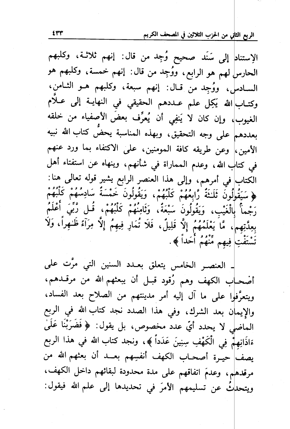 - العنصر الخامس يتعلق بعدد السنين التي مرت على أصحاب الكهف وهم رقود قبل أن يبعثهم الله من مرقدهم، ويتعرفوا على ما آل إليه أمر مدينتهم من الصلاح بعد الفساد، والإيمان بعد الشرك، وفي هذا الصدد نجد كتاب الله في الربع الماضي لا يحدد أي عدد مخصوص، بل يقول: {فَضَرَبْنَا عَلَى آذَانِهِمْ فِي الْكَهْفِ سِنِينَ عَدَدًا}، ونجد كتاب الله في هذا الربع يصف حيرة أصحاب الكهف أنفسهم بعد أن بعثهم الله من مرقدهم، وعدم اتفاقهم على مدة محدودة لبقائهم داخل الكهف، ويتحدث عن تسليمهم الأمر في تحديدها إلى علم الله فيقول: