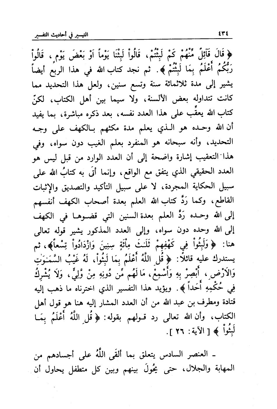 {قَالَ قَائِلٌ مِنْهُمْ كَمْ لَبِثْتُمْ قَالُوا لَبِثْنَا يَوْمًا أَوْ بَعْضَ يَوْمٍ قَالُوا رَبُّكُمْ أَعْلَمُ بِمَا لَبِثْتُمْ}. ثم نجد كتاب الله في هذا الربع أيضا يشير إلى مدة ثلاثمائة سنة وتسع سنين، ولعل هذا التحديد مما كانت تتداوله بعض الألسنة، ولاسيما بين أهل الكتاب، لكن كتاب الله يعقب على هذا العدد نفسه، بعد ذكره مباشرة، بما يفيد أن الله وحده هو الذي يعلم مدة مكثهم بالكهف على وجه التحديد، وأنه سبحانه هو المنفرد بعلم الغيب دون سواه، وفي هذا التعقيب إشارة واضحة إلى أن العدد الوارد من قبل ليس هو العدد الحقيقي الذي يتفق مع الواقع، وإنما أتى به كتاب الله على سبيل الحكاية المجردة، لا على سبيل التأكيد والتصديق والإثبات القاطع، وكما رد كتاب الله العلم بعدة أصحاب الكهف أنفسهم إلى الله وحده رد العلم بعدة السنين التي قضوها في الكهف إلى الله وحده دون سواه، وإلى العدد المذكور يشير قوله تعالى هنا: {وَلَبِثُوا فِي كَهْفِهِمْ ثَلَاثَ مِائَةٍ سِنِينَ وَازْدَادُوا تِسْعًا}. ثم يستدرك عليه قائلا: {قُلِ اللَّهُ أَعْلَمُ بِمَا لَبِثُوا لَهُ غَيْبُ السَّمَاوَاتِ وَالْأَرْضِ أَبْصِرْ بِهِ وَأَسْمِعْ مَا لَهُمْ مِنْ دُونِهِ مِنْ وَلِيٍّ وَلَا يُشْرِكُ فِي حُكْمِهِ أَحَدًا}. ويؤيد هذا التفسير الذي اختاره ما ذهب إليه قتادة ومطرف بن عبد الله من أن العدد المشار إليه هنا هو قول أهل الكتاب، وأن الله تعالى رد قولهم بقوله: {قُلِ اللَّهُ أَعْلَمُ بِمَا لَبِثُوا} [الآية: 26].