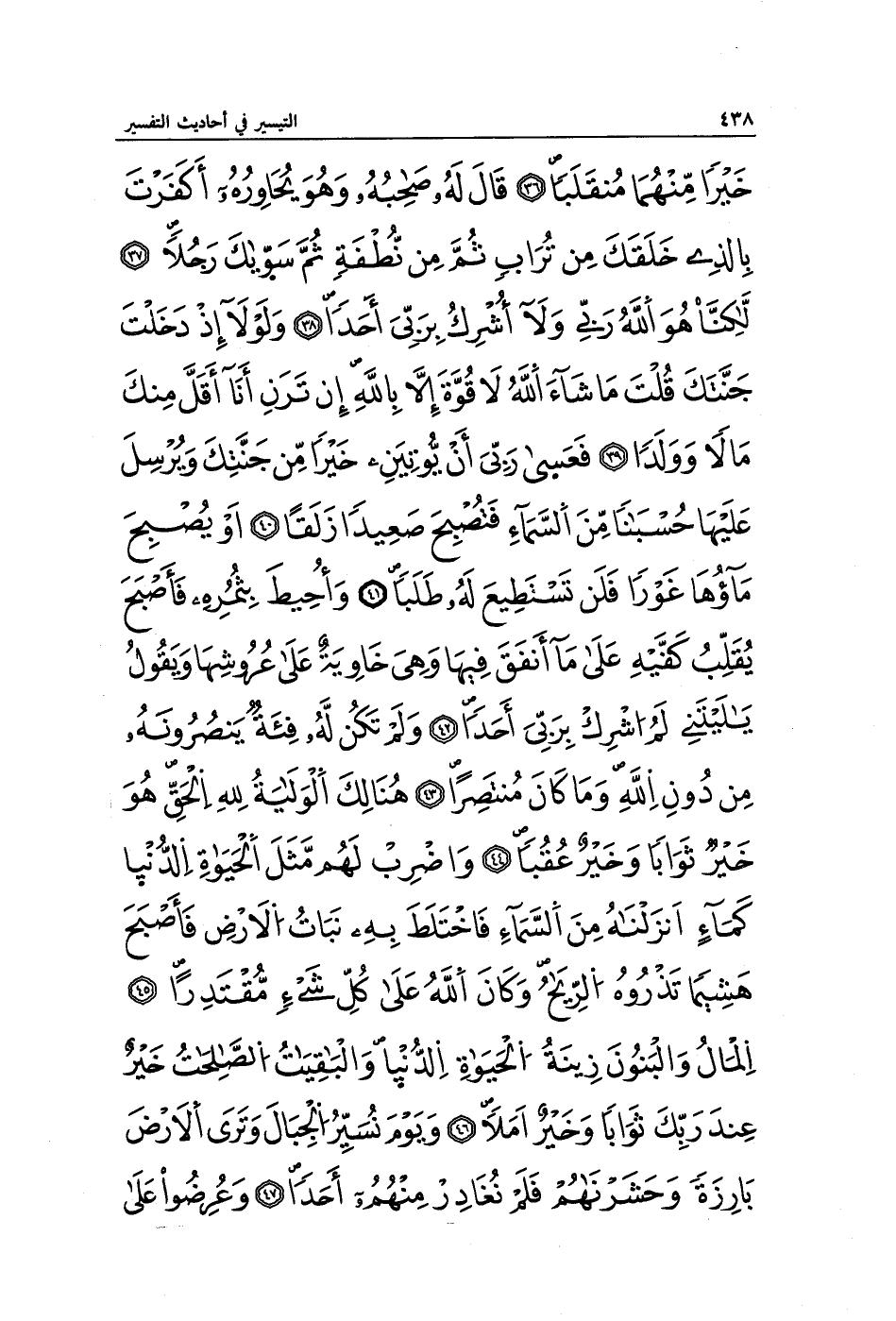 خَيْرًا مِنْهَا مُنْقَلَبًا (36) قَالَ لَهُ صَاحِبُهُ وَهُوَ يُحَاوِرُهُ أَكَفَرْتَ بِالَّذِي خَلَقَكَ مِنْ تُرَابٍ ثُمَّ مِنْ نُطْفَةٍ ثُمَّ سَوَّاكَ رَجُلًا (37) لَكِنَّا هُوَ اللَّهُ رَبِّي وَلَا أُشْرِكُ بِرَبِّي أَحَدًا (38) وَلَوْلَا إِذْ دَخَلْتَ جَنَّتَكَ قُلْتَ مَا شَاءَ اللَّهُ لَا قُوَّةَ إِلَّا بِاللَّهِ إِنْ تَرَنِ أَنَا أَقَلَّ مِنْكَ مَالًا وَوَلَدًا (39) فَعَسَى رَبِّي أَنْ يُؤْتِيَنِ خَيْرًا مِنْ جَنَّتِكَ وَيُرْسِلَ عَلَيْهَا حُسْبَانًا مِنَ السَّمَاءِ فَتُصْبِحَ صَعِيدًا زَلَقًا (40) أَوْ يُصْبِحَ مَاؤُهَا غَوْرًا فَلَنْ تَسْتَطِيعَ لَهُ طَلَبًا (41) وَأُحِيطَ بِثَمَرِهِ فَأَصْبَحَ يُقَلِّبُ كَفَّيْهِ عَلَى مَا أَنْفَقَ فِيهَا وَهِيَ خَاوِيَةٌ عَلَى عُرُوشِهَا وَيَقُولُ يَا لَيْتَنِي لَمْ أُشْرِكْ بِرَبِّي أَحَدًا (42) وَلَمْ تَكُنْ لَهُ فِئَةٌ يَنْصُرُونَهُ مِنْ دُونِ اللَّهِ وَمَا كَانَ مُنْتَصِرًا (43) هُنَالِكَ الْوَلَايَةُ لِلَّهِ الْحَقِّ هُوَ خَيْرٌ ثَوَابًا وَخَيْرٌ عُقْبًا (44) وَاضْرِبْ لَهُمْ مَثَلَ الْحَيَاةِ الدُّنْيَا كَمَاءٍ أَنْزَلْنَاهُ مِنَ السَّمَاءِ فَاخْتَلَطَ بِهِ نَبَاتُ الْأَرْضِ فَأَصْبَحَ هَشِيمًا تَذْرُوهُ الرِّيَاحُ وَكَانَ اللَّهُ عَلَى كُلِّ شَيْءٍ مُقْتَدِرًا (45) الْمَالُ وَالْبَنُونَ زِينَةُ الْحَيَاةِ الدُّنْيَا وَالْبَاقِيَاتُ الصَّالِحَاتُ خَيْرٌ عِنْدَ رَبِّكَ ثَوَابًا وَخَيْرٌ أَمَلًا (46) وَيَوْمَ نُسَيِّرُ الْجِبَالَ وَتَرَى الْأَرْضَ بَارِزَةً وَحَشَرْنَاهُمْ فَلَمْ نُغَادِرْ مِنْهُمْ أَحَدًا (47) وَعُرِضُوا عَلَى