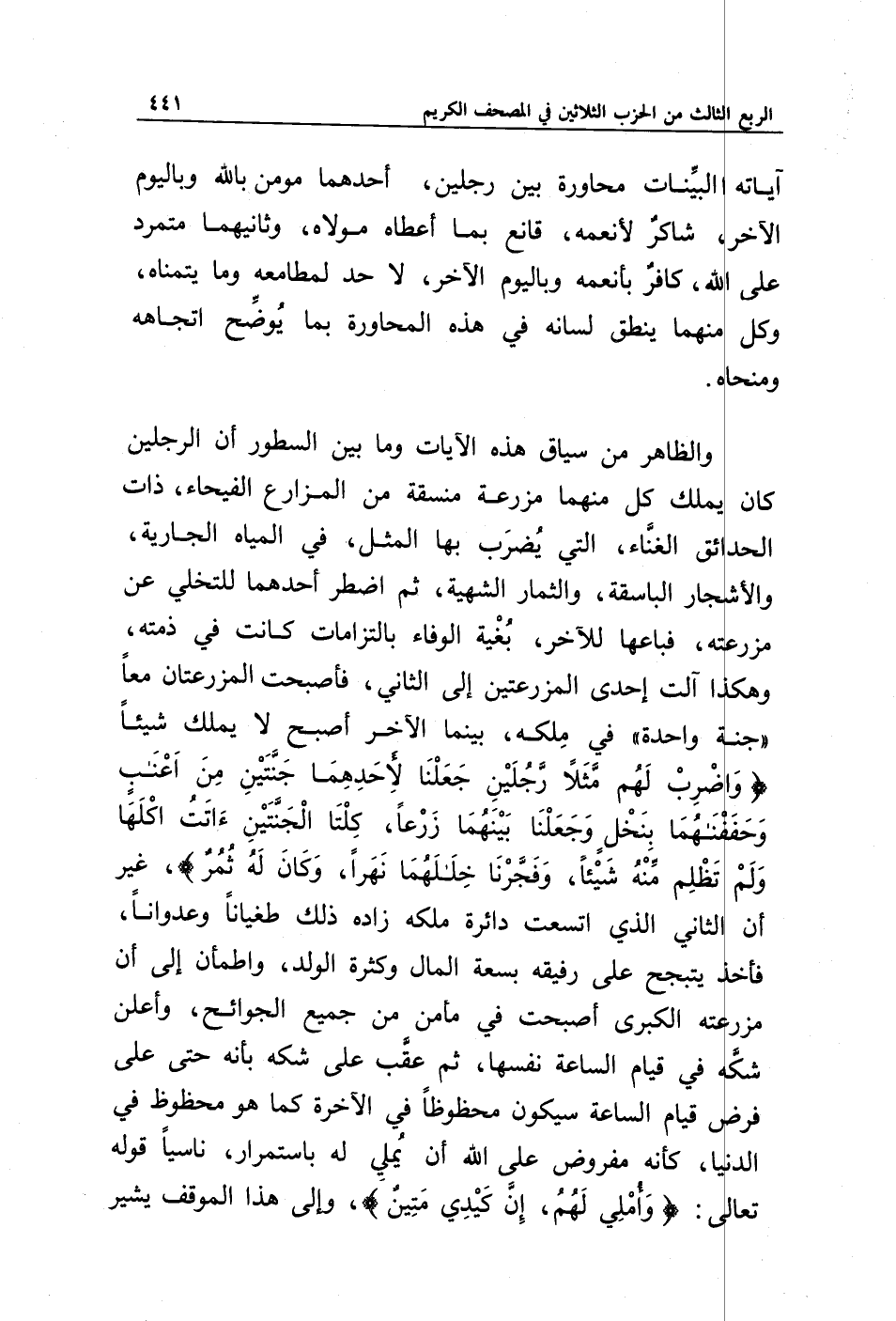 والظاهر من سياق هذه الآيات وما بين السطور أن الرجلين كان يملك كل منهما مزرعة منسقة من المزارع الفيحاء، ذات الحدائق الغناء، التي يضرب بها المثل، في المياه الجارية، والأشجار الباسقة، والثمار الشهية، ثم اضطر أحدهما للتخلي عن مزرعته، فباعها للآخر، بغية الوفاء بالتزامات كانت في ذمته، وهكذا آلت إحدى المزرعتين إلى الثاني، فأصبحت المزرعتان معا " جنة واحدة " في ملكه، بينما الآخر أصبح لا يملك شيئا {وَاضْرِبْ لَهُمْ مَثَلًا رَجُلَيْنِ جَعَلْنَا لِأَحَدِهِمَا جَنَّتَيْنِ مِنْ أَعْنَابٍ وَحَفَفْنَاهُمَا بِنَخْلٍ وَجَعَلْنَا بَيْنَهُمَا زَرْعًا * كِلْتَا الْجَنَّتَيْنِ آتَتْ أُكُلَهَا وَلَمْ تَظْلِمْ مِنْهُ شَيْئًا وَفَجَّرْنَا خِلَالَهُمَا نَهَرًا * وَكَانَ لَهُ ثَمَرٌ}، غير أن الثاني الذي اتسعت دائرة ملكه زاده ذلك طغيانا وعدوانا، فأخذ يتبجح على رفيقه بسعة المال وكثرة الولد، واطمأن إلى أن مزرعته الكبرى أصبحت في مأمن من جميع الجوائح، وأعلن شكه في قيام الساعة نفسها، ثم عقب على شكه بأنه حتى على فرض قيام الساعة سيكون محظوظا في الآخرة كما هو محظوظ في الدنيا، كأنه مفروض على الله أن يملي له باستمرار، ناسيا قوله تعالى: {وَأُمْلِي لَهُمْ إِنَّ كَيْدِي مَتِينٌ}، وإلى هذا الموقف يشير
