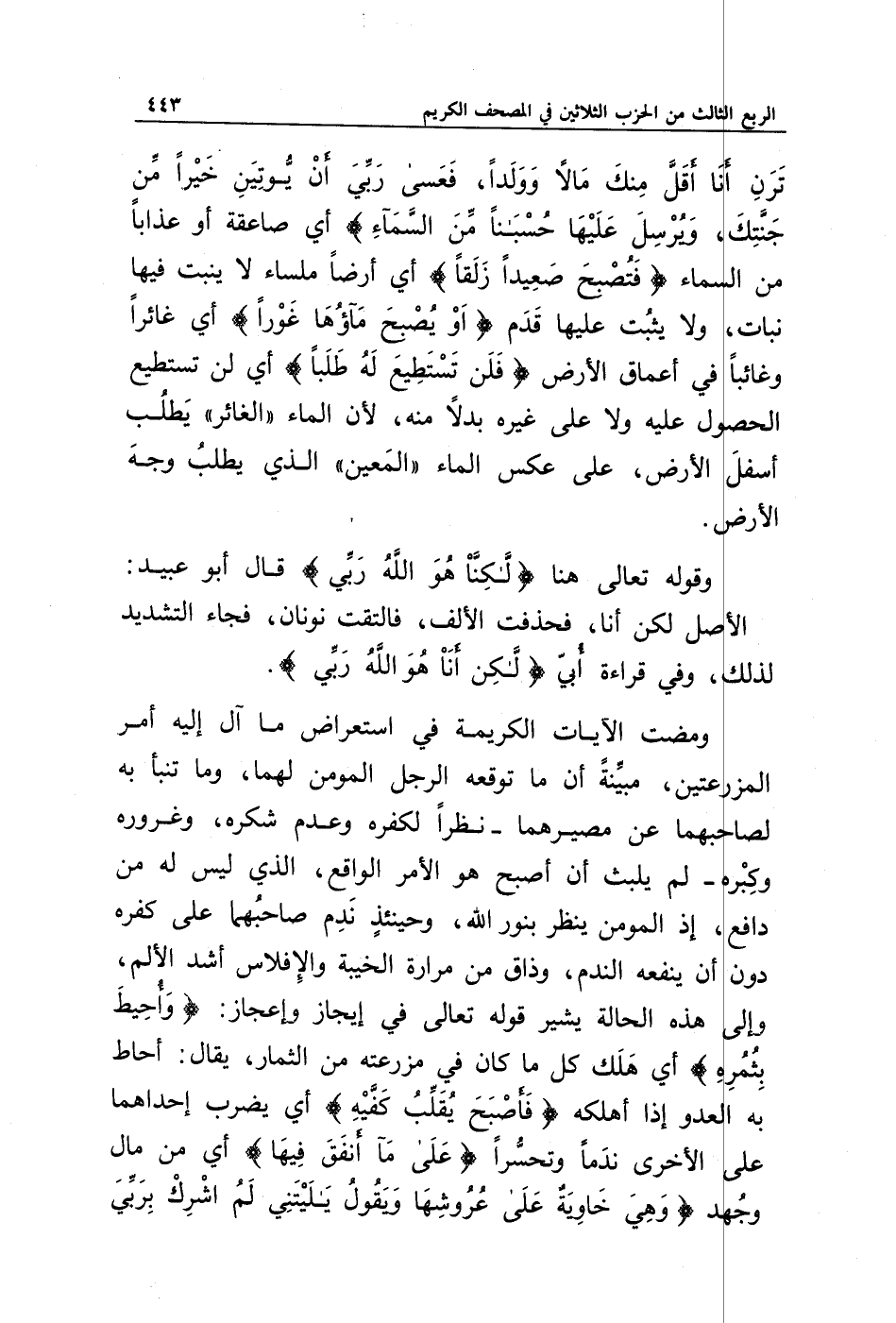 تَرَنِ أَنَا أَقَلَّ مِنْكَ مَالًا وَوَلَدًا * فَعَسَى رَبِّي أَنْ يُؤْتِيَنِ خَيْرًا مِنْ جَنَّتِكَ وَيُرْسِلَ عَلَيْهَا حُسْبَانًا مِنَ السَّمَاءِ} أي صاعقة أو عذابا من السماء {فَتُصْبِحَ صَعِيدًا زَلَقًا} أي أرضا ملساء لا ينبت فيها نبات، ولا يثبت عليها قدم {أَوْ يُصْبِحَ مَاؤُهَا غَوْرًا} أي غائرا وغائبا في أعماق الأرض {فَلَنْ تَسْتَطِيعَ لَهُ طَلَبًا} أي لن تستطيع الحصول عليه ولا على غيره بدلا منه، لأن الماء " الغائر " يطلب أسفل الأرض، على عكس الماء " المعين " الذي يطلب وجه الأرض.