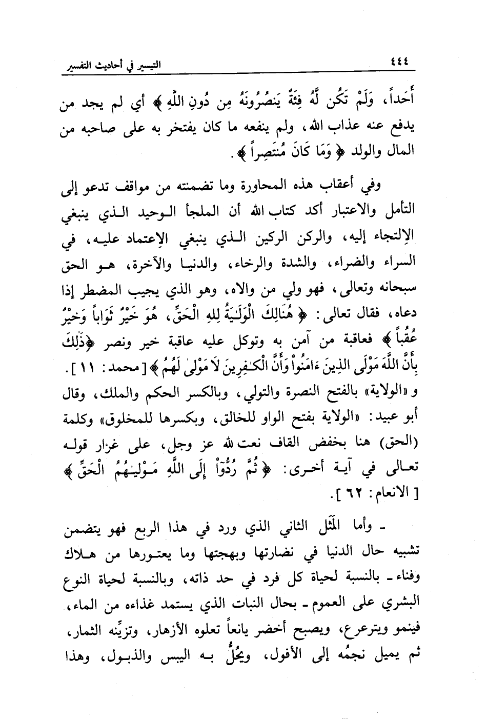 وفي أعقاب هذه المحاورة وما تضمنته من مواقف تدعو إلى التأمل والاعتبار أكد كتاب الله أن الملجأ الوحيد الذي ينبغي الالتجاء إليه، والركن الركين الذي ينبغي الاعتماد عليه، في السراء والضراء، والشدة والرخاء، والدنيا والآخرة، هو الحق سبحانه وتعالى، فهو ولي من والاه، وهو الذي يجيب المضطر إذا دعاه، فقال تعالى: {هُنَالِكَ الْوَلَايَةُ لِلَّهِ الْحَقِّ هُوَ خَيْرٌ ثَوَابًا وَخَيْرٌ عُقْبًا} فعاقبة من آمن به وتوكل عليه عاقبة خير ونصر {ذَلِكَ بِأَنَّ اللَّهَ مَوْلَى الَّذِينَ آمَنُوا وَأَنَّ الْكَافِرِينَ لَا مَوْلَى لَهُمْ} [محمد: 11]. و " الولاية " بالفتح النصرة والتولي، وبالكسر الحكم والملك، وقال أبو عبيد: " الولاية بفتح الواو للخالق، وبكسرها للمخلوق " وكلمة {الْحَقِّ} هنا بخفض القاف نعت لله عز وجل، على غرار قوله تعالى في آية أخرى: {ثُمَّ رُدُّوا إِلَى اللَّهِ مَوْلَاهُمُ الْحَقِّ} [الأنعام: 62].