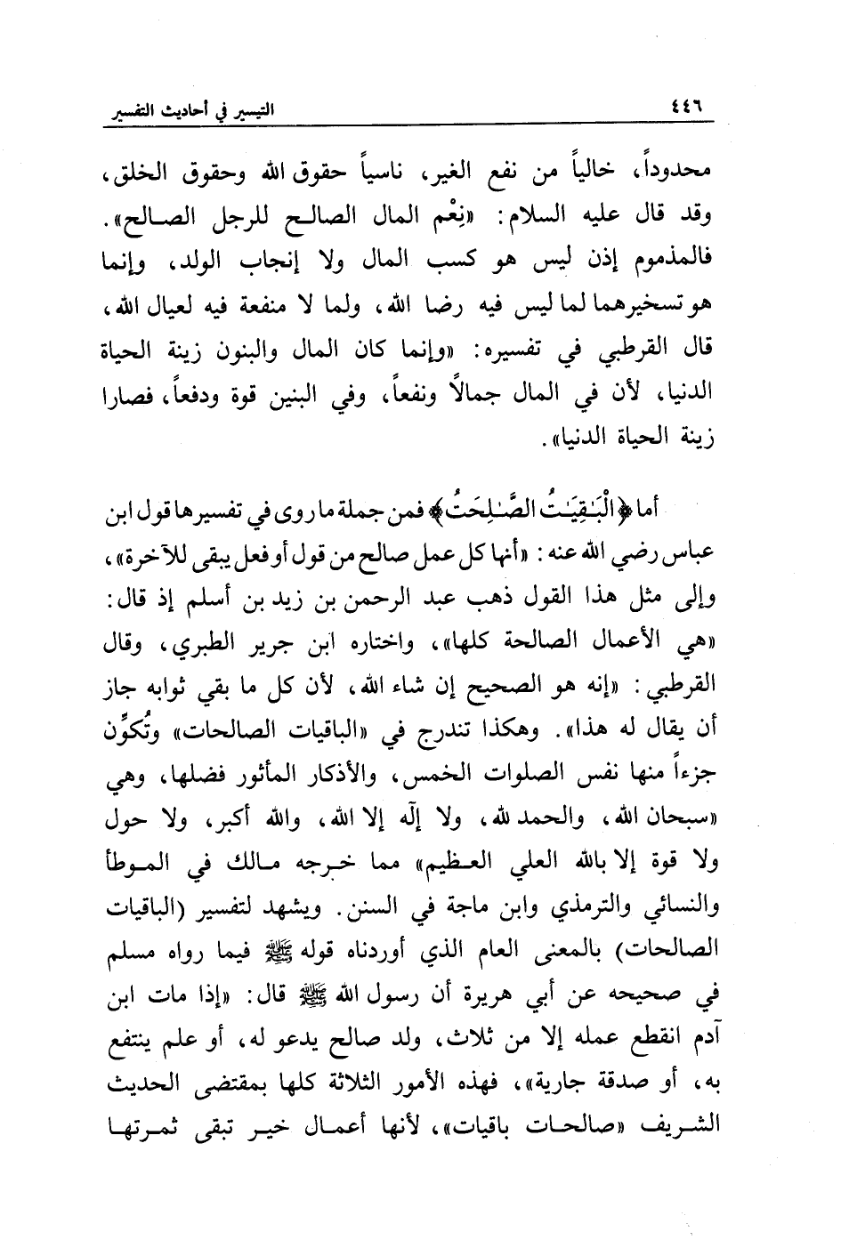 أما {الْبَاقِيَاتُ الصَّالِحَاتُ} فمن جملة ما روى في تفسيرهما قول ابن عباس رضي الله عنه: " أنها كل عمل صالح من قول أو فعل يبقى للآخرة "، وإلى مثل هذا القول ذهب عبد الرحمان بن زيد بن أسلم إذ قال: " هي الأعمال الصالحة كلها "، واختاره ابن جرير الطبري، وقال القرطبي: " إنه هو الصحيح إن شاء الله، لأن كل ما بقي ثوابه جاز أن يقال له هذا ". وهكذا تندرج في " الباقيات الصالحات " وتكون جزءا منها نفس الصلوات الخمس، والأذكار المأثور فضلها، وهي " سبحان الله، والحمد لله، ولا إله إلا الله، والله أكبر، ولا حول ولا قوة إلا بالله العلي العظيم " مما خرجه مالك في الموطأ والنسائي والترمذي وابن ماجة في السنن، ويشهد لتفسير (الباقيات الصالحات) بالمعنى العام الذي أوردناه قوله صلى الله عليه وسلم فيما رواه مسلم في صحيحه عن أبي هريرة أن رسول الله صلى الله عليه وسلم قال: (إذا مات ابن آدم انقطع عمله إلا من ثلاث، ولد صالح يدعو له، أو علم ينتفع به، أو صدقة جارية)، فهذه الأمور الثلاثة كلها بمقتضى الحديث الشريف " صالحات باقيات " لأنها أعمال خير تبقى ثمرتها