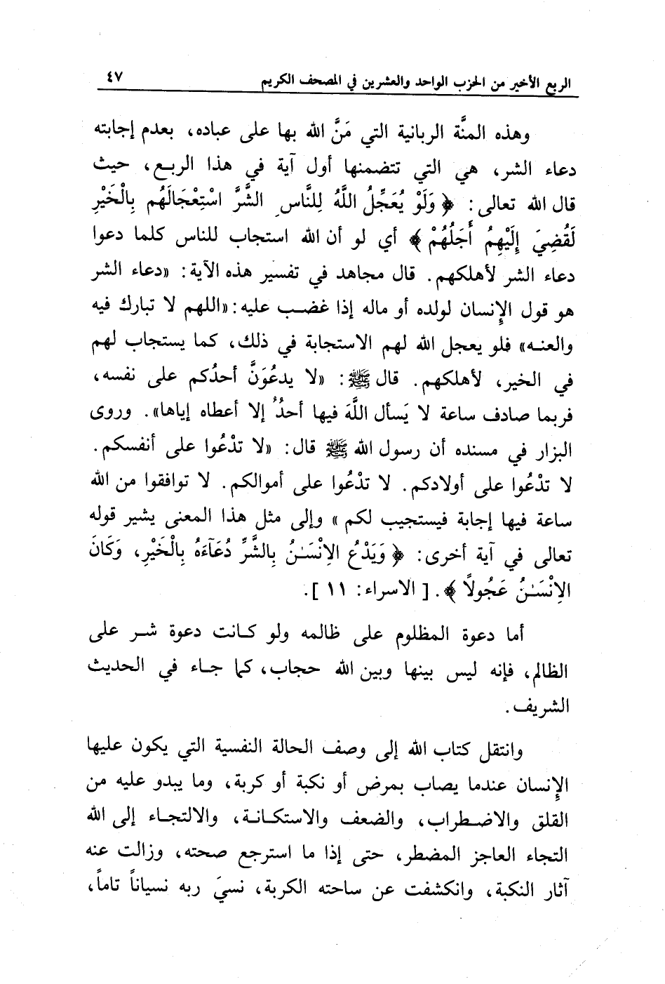 وهذه المنة الربانية التي من الله بها على عباده، بعدم إجابته دعاء الشر، هي التي تتضمنها أول آية في هذا الربع، حيث قال الله تعالى: {وَلَوْ يُعَجِّلُ اللَّهُ لِلنَّاسِ الشَّرَّ اسْتِعْجَالَهُمْ بِالْخَيْرِ لَقُضِيَ إِلَيْهِمْ أَجَلُهُمْ} أي لو أن الله استجاب للناس كلما دعوا دعاء الشر لأهلكهم. قال مجاهد في تفسير هذه الآية: " دعاء الشر هو قول الإنسان لولده أو ماله إذا غضب عليه: " اللهم لا تبارك فيه والعنه " فلو يعجل الله لهم الاستجابة في ذلك، كما يستجاب لهم في الخير، لأهلكهم. قال صلى الله عليه وسلم: (لا يدعون أحدكم على نفسه، فربما صادف ساعة لا يسأل الله فيها أحد إلا أعطاه إياها). وروى البزار في مسنده أن رسول الله صلى الله عليه وسلم قال: (لا تدعوا على أنفسكم. لا تدعوا على أولادكم. لا تدعوا على أموالكم. لا توافقوا من الله ساعة فيها إجابة فيستجيب لكم) وإلى مثل هذا المعنى يشير قوله تعالى في آية أخرى: {وَيَدْعُ الْإِنْسَانُ بِالشَّرِّ دُعَاءَهُ بِالْخَيْرِ وَكَانَ الْإِنْسَانُ عَجُولًا}. [الإسراء: 11].