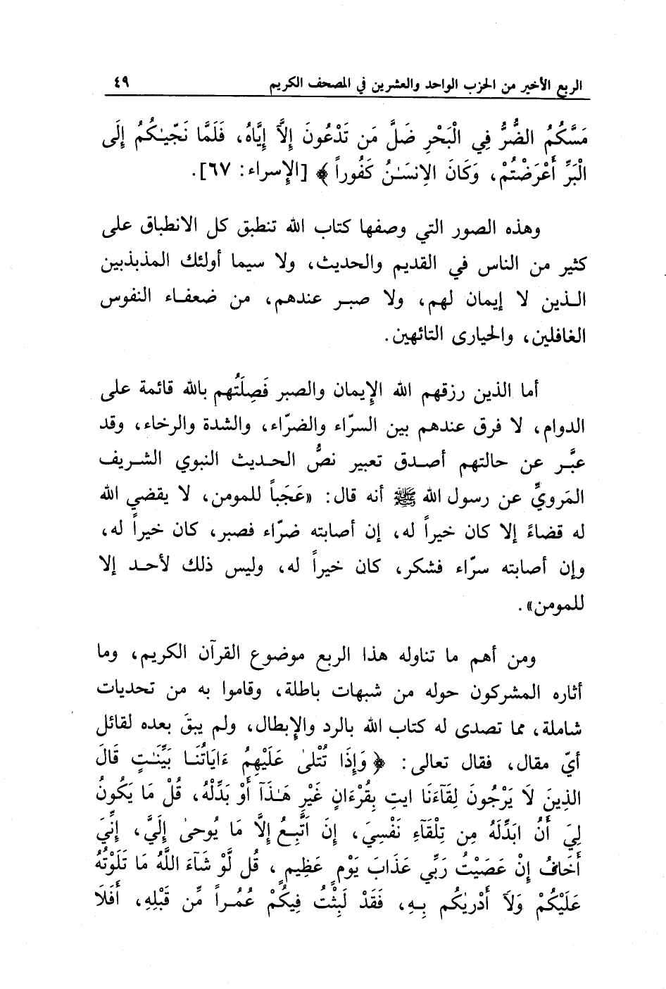 أما الذين رزقهم الله الإيمان والصبر فصلتهم بالله قائمة على الدوام، لا فرق عندهم بين السراء والضراء، والشدة والرخاء، وقد عبر عن حالتهم أصدق تعبير نص الحديث النبوي الشريف المروي عن رسول الله صلى الله عليه وسلم أنه قال: (عجبا للمؤمن، لا يقضي الله له قضاء إلا كان خيرا له، إن أصابته ضراء فصبر، فكان خيرا له، وإن أصابته سراء فشكر، كان خيرا له، وليس ذلك لأحد إلا للمؤمن).