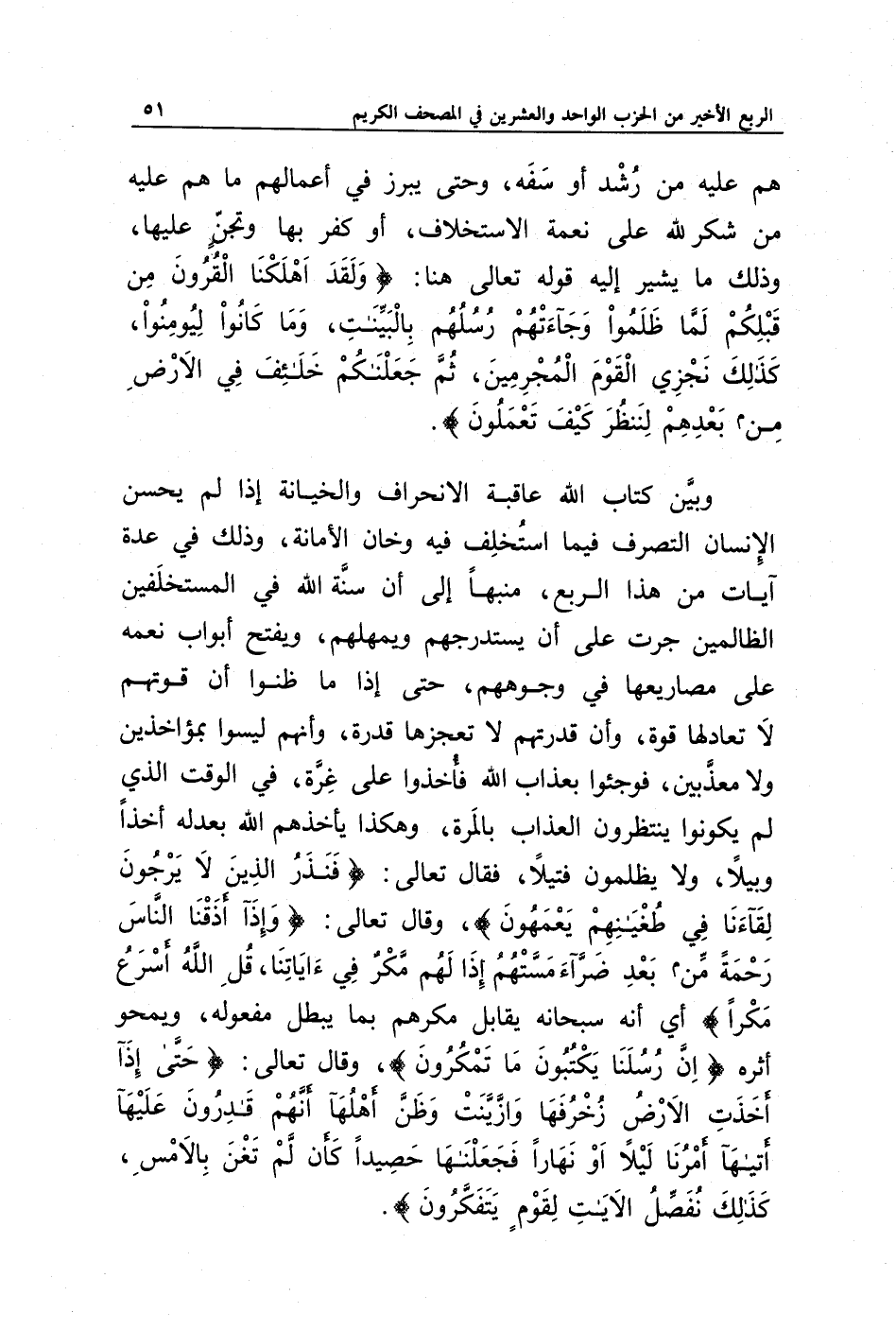 وبين كتاب الله عاقبة الانحراف والخيانة إذا لم يحسن الإنسان التصرف فيما استخلف فيه وخان الأمانة، وذلك في عدة آيات من هذا الربع، منبها إلى أن سنة الله في المستخلفين الظالمين جرت على أن يستدرجهم ويمهلهم، ويفتح أبواب نعمه على مصاريعها في وجوههم، حتى إذا ما ظنوا أن قوتهم لا تعادلها قوة، وأن قدرتهم لا تعجزها قدرة، وأنهم ليسوا بمؤاخذين ولا معذبين، فوجئوا بعذاب الله فأخذوا على غرة، في الوقت الذي لم يكونوا ينتظرون العذاب بالمرة، فقال تعالى: {فَنَذَرُ الَّذِينَ لَا يَرْجُونَ لِقَاءَنَا فِي طُغْيَانِهِمْ يَعْمَهُونَ}، وقال تعالى: {وَإِذَا أَذَقْنَا النَّاسَ رَحْمَةً مِنْ بَعْدِ ضَرَّاءَ مَسَّتْهُمْ إِذَا لَهُمْ مَكْرٌ فِي آيَاتِنَا قُلِ اللَّهُ أَسْرَعُ مَكْرًا} أي أنه سبحانه يقابل مكرهم بما يبطل مفعوله، ويمحو أثره {إِنَّ رُسُلَنَا يَكْتُبُونَ مَا تَمْكُرُونَ}، وقال تعالى: {حَتَّى إِذَا أَخَذَتِ الْأَرْضُ زُخْرُفَهَا وَازَّيَّنَتْ وَظَنَّ أَهْلُهَا أَنَّهُمْ قَادِرُونَ عَلَيْهَا أَتَاهَا أَمْرُنَا لَيْلًا أَوْ نَهَارًا فَجَعَلْنَاهَا حَصِيدًا كَأَنْ لَمْ تَغْنَ بِالْأَمْسِ كَذَلِكَ نُفَصِّلُ الْآيَاتِ لِقَوْمٍ يَتَفَكَّرُونَ}.