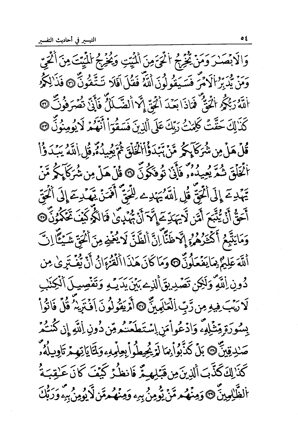 وَالْأَبْصَارَ وَمَنْ يُخْرِجُ الْحَيَّ مِنَ الْمَيِّتِ وَيُخْرِجُ الْمَيِّتَ مِنَ الْحَيِّ وَمَنْ يُدَبِّرُ الْأَمْرَ فَسَيَقُولُونَ اللَّهُ فَقُلْ أَفَلَا تَتَّقُونَ (31) فَذَلِكُمُ اللَّهُ رَبُّكُمُ الْحَقُّ فَمَاذَا بَعْدَ الْحَقِّ إِلَّا الضَّلَالُ فَأَنَّى تُصْرَفُونَ (32) كَذَلِكَ حَقَّتْ كَلِمَتُ رَبِّكَ عَلَى الَّذِينَ فَسَقُوا أَنَّهُمْ لَا يُؤْمِنُونَ (33) قُلْ هَلْ مِنْ شُرَكَائِكُمْ مَنْ يَبْدَأُ الْخَلْقَ ثُمَّ يُعِيدُهُ قُلِ اللَّهُ يَبْدَأُ الْخَلْقَ ثُمَّ يُعِيدُهُ فَأَنَّى تُؤْفَكُونَ (34) قُلْ هَلْ مِنْ شُرَكَائِكُمْ مَنْ يَهْدِي إِلَى الْحَقِّ قُلِ اللَّهُ يَهْدِي لِلْحَقِّ أَفَمَنْ يَهْدِي إِلَى الْحَقِّ أَحَقُّ أَنْ يُتَّبَعَ أَمَّنْ لَا يَهِدِّي إِلَّا أَنْ يُهْدَى فَمَا لَكُمْ كَيْفَ تَحْكُمُونَ (35) وَمَا يَتَّبِعُ أَكْثَرُهُمْ إِلَّا ظَنًّا إِنَّ الظَّنَّ لَا يُغْنِي مِنَ الْحَقِّ شَيْئًا إِنَّ اللَّهَ عَلِيمٌ بِمَا يَفْعَلُونَ (36) وَمَا كَانَ هَذَا الْقُرْآنُ أَنْ يُفْتَرَى مِنْ دُونِ اللَّهِ وَلَكِنْ تَصْدِيقَ الَّذِي بَيْنَ يَدَيْهِ وَتَفْصِيلَ الْكِتَابِ لَا رَيْبَ فِيهِ مِنْ رَبِّ الْعَالَمِينَ (37) أَمْ يَقُولُونَ افْتَرَاهُ قُلْ فَأْتُوا بِسُورَةٍ مِثْلِهِ وَادْعُوا مَنِ اسْتَطَعْتُمْ مِنْ دُونِ اللَّهِ إِنْ كُنْتُمْ صَادِقِينَ (38) بَلْ كَذَّبُوا بِمَا لَمْ يُحِيطُوا بِعِلْمِهِ وَلَمَّا يَأْتِهِمْ تَأْوِيلُهُ كَذَلِكَ كَذَّبَ الَّذِينَ مِنْ قَبْلِهِمْ فَانْظُرْ كَيْفَ كَانَ عَاقِبَةُ الظَّالِمِينَ (39) وَمِنْهُمْ مَنْ يُؤْمِنُ بِهِ وَمِنْهُمْ مَنْ لَا يُؤْمِنُ بِهِ وَرَبُّكَ