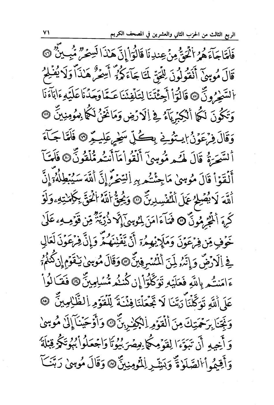 فَلَمَّا جَاءَهُمُ الْحَقُّ مِنْ عِنْدِنَا قَالُوا إِنَّ هَذَا لَسِحْرٌ مُبِينٌ (76) قَالَ مُوسَى أَتَقُولُونَ لِلْحَقِّ لَمَّا جَاءَكُمْ أَسِحْرٌ هَذَا وَلَا يُفْلِحُ السَّاحِرُونَ (77) قَالُوا أَجِئْتَنَا لِتَلْفِتَنَا عَمَّا وَجَدْنَا عَلَيْهِ آبَاءَنَا وَتَكُونَ لَكُمَا الْكِبْرِيَاءُ فِي الْأَرْضِ وَمَا نَحْنُ لَكُمَا بِمُؤْمِنِينَ (78) وَقَالَ فِرْعَوْنُ ائْتُونِي بِكُلِّ سَاحِرٍ عَلِيمٍ (79) فَلَمَّا جَاءَ السَّحَرَةُ قَالَ لَهُمْ مُوسَى أَلْقُوا مَا أَنْتُمْ مُلْقُونَ (80) فَلَمَّا أَلْقَوْا قَالَ مُوسَى مَا جِئْتُمْ بِهِ السِّحْرُ إِنَّ اللَّهَ سَيُبْطِلُهُ إِنَّ اللَّهَ لَا يُصْلِحُ عَمَلَ الْمُفْسِدِينَ (81) وَيُحِقُّ اللَّهُ الْحَقَّ بِكَلِمَاتِهِ وَلَوْ كَرِهَ الْمُجْرِمُونَ (82) فَمَا آمَنَ لِمُوسَى إِلَّا ذُرِّيَّةٌ مِنْ قَوْمِهِ عَلَى خَوْفٍ مِنْ فِرْعَوْنَ وَمَلَئِهِمْ أَنْ يَفْتِنَهُمْ وَإِنَّ فِرْعَوْنَ لَعَالٍ فِي الْأَرْضِ وَإِنَّهُ لَمِنَ الْمُسْرِفِينَ (83) وَقَالَ مُوسَى يَا قَوْمِ إِنْ كُنْتُمْ آمَنْتُمْ بِاللَّهِ فَعَلَيْهِ تَوَكَّلُوا إِنْ كُنْتُمْ مُسْلِمِينَ (84) فَقَالُوا عَلَى اللَّهِ تَوَكَّلْنَا رَبَّنَا لَا تَجْعَلْنَا فِتْنَةً لِلْقَوْمِ الظَّالِمِينَ (85) وَنَجِّنَا بِرَحْمَتِكَ مِنَ الْقَوْمِ الْكَافِرِينَ (86) وَأَوْحَيْنَا إِلَى مُوسَى وَأَخِيهِ أَنْ تَبَوَّآ لِقَوْمِكُمَا بِمِصْرَ بُيُوتًا وَاجْعَلُوا بُيُوتَكُمْ قِبْلَةً وَأَقِيمُوا الصَّلَاةَ وَبَشِّرِ الْمُؤْمِنِينَ (87) وَقَالَ مُوسَى رَبَّنَا