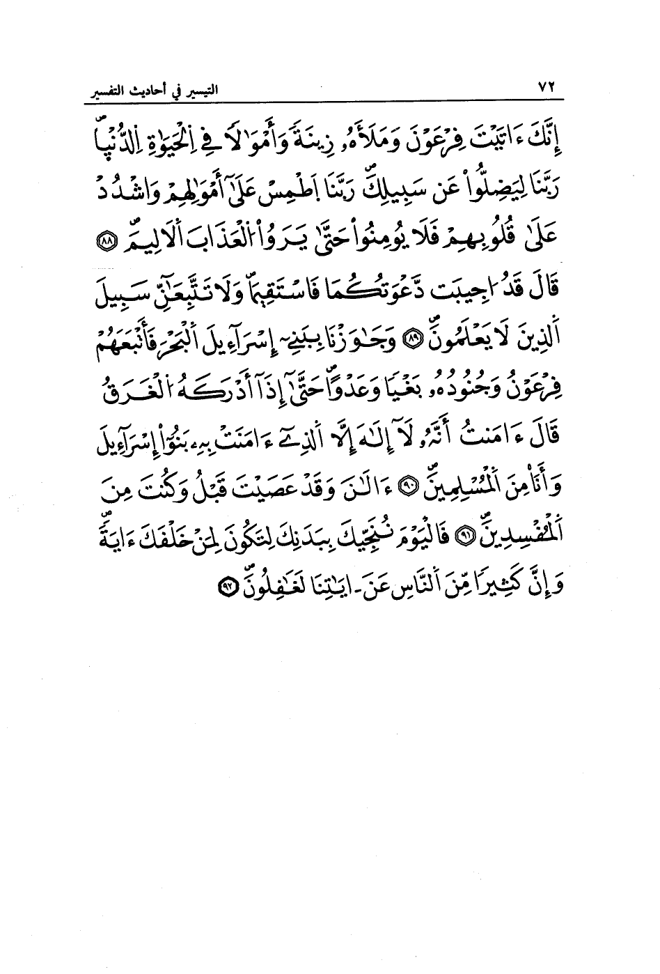 إِنَّكَ آتَيْتَ فِرْعَوْنَ وَمَلَأَهُ زِينَةً وَأَمْوَالًا فِي الْحَيَاةِ الدُّنْيَا رَبَّنَا لِيُضِلُّوا عَنْ سَبِيلِكَ رَبَّنَا اطْمِسْ عَلَى أَمْوَالِهِمْ وَاشْدُدْ عَلَى قُلُوبِهِمْ فَلَا يُؤْمِنُوا حَتَّى يَرَوُا الْعَذَابَ الْأَلِيمَ (88) قَالَ قَدْ أُجِيبَتْ دَعْوَتُكُمَا فَاسْتَقِيمَا وَلَا تَتَّبِعَانِّ سَبِيلَ الَّذِينَ لَا يَعْلَمُونَ (89) وَجَاوَزْنَا بِبَنِي إِسْرَائِيلَ الْبَحْرَ فَأَتْبَعَهُمْ فِرْعَوْنُ وَجُنُودُهُ بَغْيًا وَعَدْوًا حَتَّى إِذَا أَدْرَكَهُ الْغَرَقُ قَالَ آمَنْتُ أَنَّهُ لَا إِلَهَ إِلَّا الَّذِي آمَنَتْ بِهِ بَنُو إِسْرَائِيلَ وَأَنَا مِنَ الْمُسْلِمِينَ (90) آلْآنَ وَقَدْ عَصَيْتَ قَبْلُ وَكُنْتَ مِنَ الْمُفْسِدِينَ (91) فَالْيَوْمَ نُنَجِّيكَ بِبَدَنِكَ لِتَكُونَ لِمَنْ خَلْفَكَ آيَةً وَإِنَّ كَثِيرًا مِنَ النَّاسِ عَنْ آيَاتِنَا لَغَافِلُونَ (92)