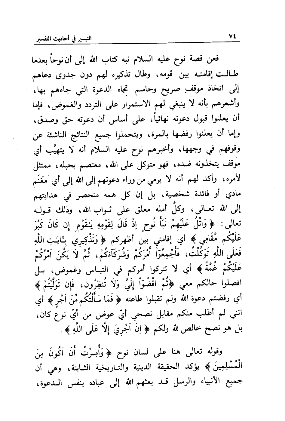 فعن قصة نوح عليه السلام نبه كتاب الله إلى أن نوحا بعدما طالت إقامته بين قومه، وطال تذكيره لهم دون جدوى دعاهم إلى اتخاذ موقف صريح وحاسم تجاه الدعوة التي جاءهم بها، وأشعرهم بأنه لا ينبغي لهم الاستمرار على التردد والغموض، فإما أن يعلنوا قبول دعوته نهائيا، على أساس أن دعوته حق وصدق، وإما أن يعلنوا رفضها بالمرة، ويتحملوا جميع النتائج الناشئة عن وقوفهم في وجهها، وأخبرهم نوح عليه السلام أنه لا يتهيب أي موقف يتخذونه ضده، فهو متوكل على الله، معتصم بحبله، ممتثل لأمره، وأكد أنه لا يرمي من وراء دعوتهم إلى الله إلى أي مغنم مادي أو فائدة شخصية، بل إن كل همه منحصر في هدايتهم إلى الله تعالى، وكل أمله معلق على ثواب الله، وذلك قوله تعالى: {وَاتْلُ عَلَيْهِمْ نَبَأَ نُوحٍ إِذْ قَالَ لِقَوْمِهِ يَا قَوْمِ إِنْ كَانَ كَبُرَ عَلَيْكُمْ مَقَامِي} أي إقامتي بين أظهركم {وَتَذْكِيرِي بِآيَاتِ اللَّهِ فَعَلَى اللَّهِ تَوَكَّلْتُ فَأَجْمِعُوا أَمْرَكُمْ وَشُرَكَاءَكُمْ ثُمَّ لَا يَكُنْ أَمْرُكُمْ عَلَيْكُمْ غُمَّةً} أي لا تتركوا أمركم في التباس وغموض، بل افصلوا حالكم معي {ثُمَّ اقْضُوا إِلَيَّ وَلَا تُنْظِرُونِ * فَإِنْ تَوَلَّيْتُمْ} أي رفضتم دعوة الله ولم تقبلوا طاعته {فَمَا سَأَلْتُكُمْ مِنْ أَجْرٍ} أي أنني لم أطلب منكم مقابل نصحي أي عوض من أي نوع كان، بل هو نصح خالص لله ولكم {إِنْ أَجْرِيَ إِلَّا عَلَى اللَّهِ}.