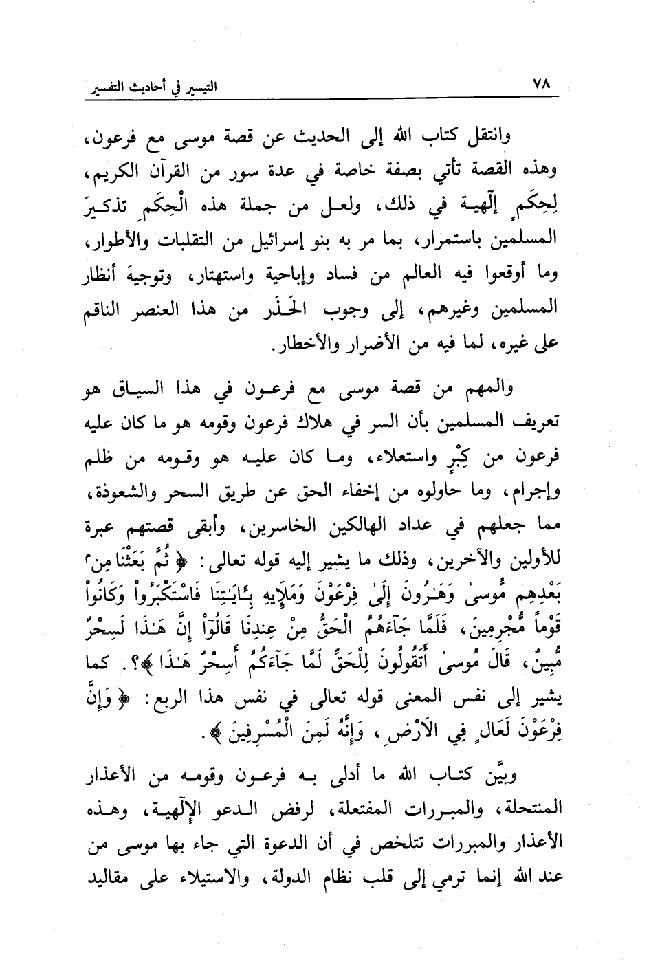 وانتقل كتاب الله إلى الحديث عن قصة موسى وفرعون، وهذه القصة تأتي بصفة خاصة في عدة سور من القرآن الكريم، لحكم إلهية في ذلك، ولعل من جملة هذه الحكم تذكير المسلمين باستمرار، بما مر به بنو إسرائيل من التقلبات والأطوار، وما أوقعوا فيه العالم من فساد وإباحية واستهتار، وتوجيه أنظار المسلمين وغيرهم، إلى وجوب الحذر من هذا العنصر الناقم على غيره، لما فيه من الأضرار والأخطار.