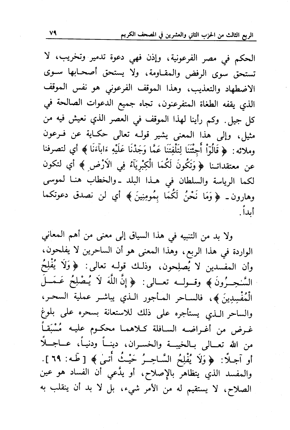 ولا بد من التنبيه في هذا السياق إلى معنى من أهم المعاني الواردة في هذا الربع، وهذا المعنى هو أن الساحرين لا يفلحون، وأن المفسدين لا يصلحون، وذلك قوله تعالى: {وَلَا يُفْلِحُ السَّاحِرُونَ} وقوله تعالى: {إِنَّ اللَّهَ لَا يُصْلِحُ عَمَلَ الْمُفْسِدِينَ}، فالساحر المأجور الذي يباشر عملية السحر، والساحر الذي يستأجره على ذلك للاستعانة بسحره على بلوغ غرض من أغراضه السافلة كلاهما محكوم عليه مسبقا من الله تعالى بالخيبة والخسران، دينا ودنيا، عاجلا أو آجلا: {وَلَا يُفْلِحُ السَّاحِرُ حَيْثُ أَتَى} [طه: 69]. والمفسد الذي يتظاهر بالإصلاح، أو يدعي أن الفساد هو عين الصلاح، لا يستقيم له من الأمر شيء، بل لا بد أن ينقلب به