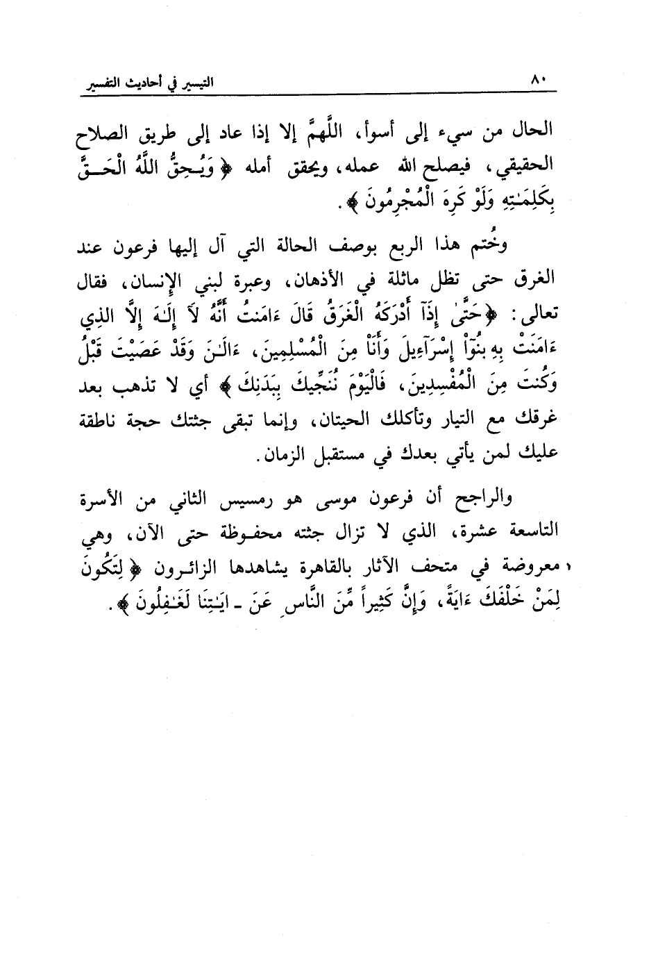 وخُتم هذا الربع بوصف الحالة التي آل إليها فرعون عند الغرق حتى تظل ماثلة في الأذهان، وعبرة لبني الإنسان، فقال تعالى: {حَتَّى إِذَا أَدْرَكَهُ الْغَرَقُ قَالَ آمَنْتُ أَنَّهُ لَا إِلَهَ إِلَّا الَّذِي آمَنَتْ بِهِ بَنُو إِسْرَائِيلَ وَأَنَا مِنَ الْمُسْلِمِينَ * آلْآنَ وَقَدْ عَصَيْتَ قَبْلُ وَكُنْتَ مِنَ الْمُفْسِدِينَ * فَالْيَوْمَ نُنَجِّيكَ بِبَدَنِكَ} أي لا تذهب بعد غرقك مع التيار وتأكلك الحيتان، وإنما تبقى جثتك حجة ناطقة عليك لمن يأتي بعدك في مستقبل الزمان.