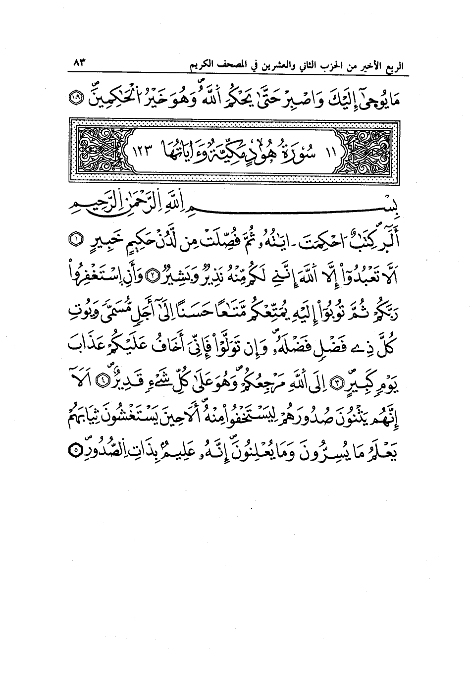 الر كِتَابٌ أُحْكِمَتْ آيَاتُهُ ثُمَّ فُصِّلَتْ مِنْ لَدُنْ حَكِيمٍ خَبِيرٍ (1) أَلَّا تَعْبُدُوا إِلَّا اللَّهَ إِنَّنِي لَكُمْ مِنْهُ نَذِيرٌ وَبَشِيرٌ (2) وَأَنِ اسْتَغْفِرُوا رَبَّكُمْ ثُمَّ تُوبُوا إِلَيْهِ يُمَتِّعْكُمْ مَتَاعًا حَسَنًا إِلَى أَجَلٍ مُسَمًّى وَيُؤْتِ كُلَّ ذِي فَضْلٍ فَضْلَهُ وَإِنْ تَوَلَّوْا فَإِنِّي أَخَافُ عَلَيْكُمْ عَذَابَ يَوْمٍ كَبِيرٍ (3) إِلَى اللَّهِ مَرْجِعُكُمْ وَهُوَ عَلَى كُلِّ شَيْءٍ قَدِيرٌ (4) أَلَا إِنَّهُمْ يَثْنُونَ صُدُورَهُمْ لِيَسْتَخْفُوا مِنْهُ أَلَا حِينَ يَسْتَغْشُونَ ثِيَابَهُمْ يَعْلَمُ مَا يُسِرُّونَ وَمَا يُعْلِنُونَ إِنَّهُ عَلِيمٌ بِذَاتِ الصُّدُورِ (5)