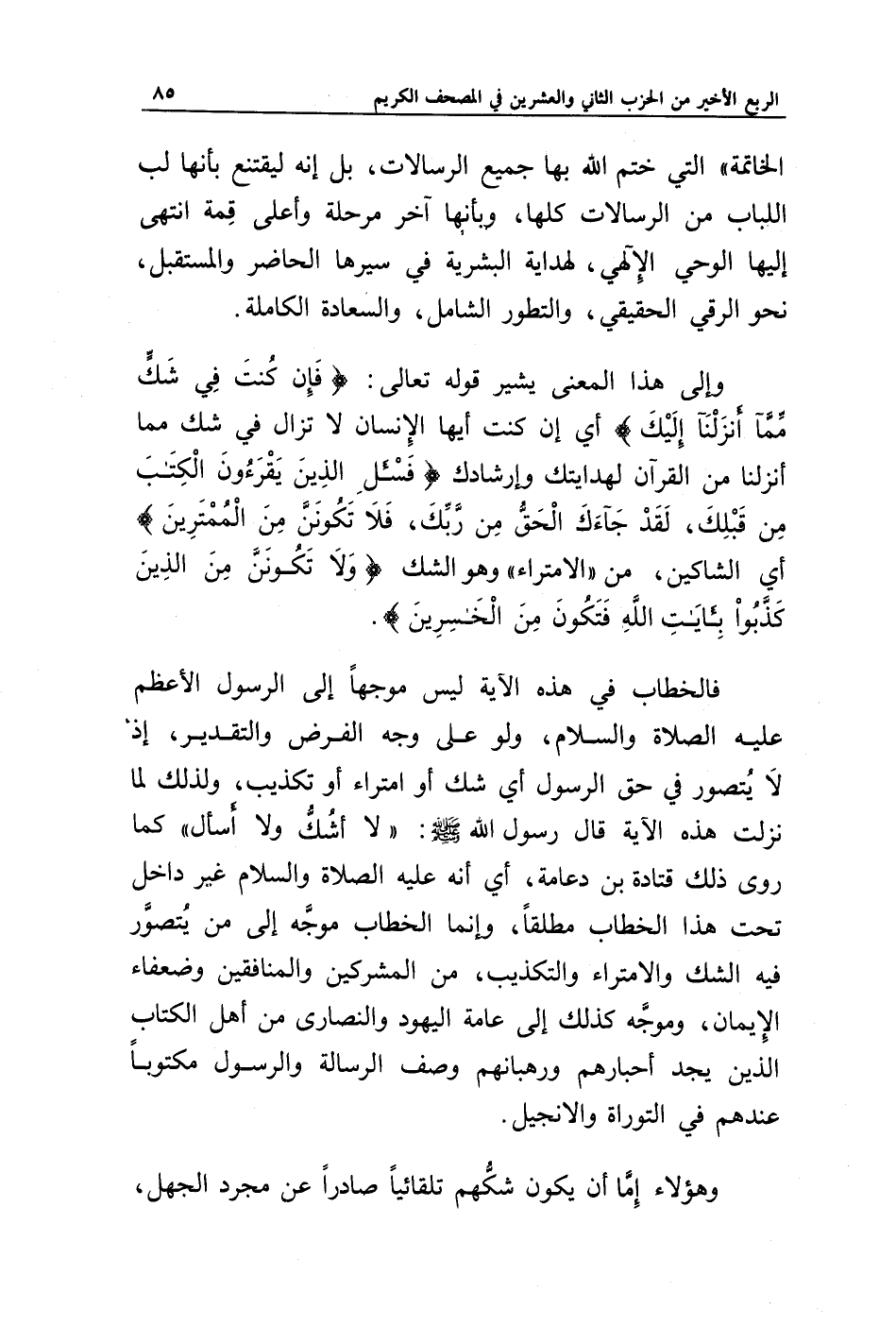 وإلى هذا المعنى يشير قوله تعالى: {فَإِنْ كُنْتَ فِي شَكٍّ مِمَّا أَنْزَلْنَا إِلَيْكَ} أي إن كنت أيها الإنسان لا تزال في شك مما أنزلنا من القرآن لهدايتك وإرشادك {فَاسْأَلِ الَّذِينَ يَقْرَءُونَ الْكِتَابَ مِنْ قَبْلِكَ لَقَدْ جَاءَكَ الْحَقُّ مِنْ رَبِّكَ فَلَا تَكُونَنَّ مِنَ الْمُمْتَرِينَ} أي الشاكين، من " الامتراء " وهو الشك {وَلَا تَكُونَنَّ مِنَ الَّذِينَ كَذَّبُوا بِآيَاتِ اللَّهِ فَتَكُونَ مِنَ الْخَاسِرِينَ}.