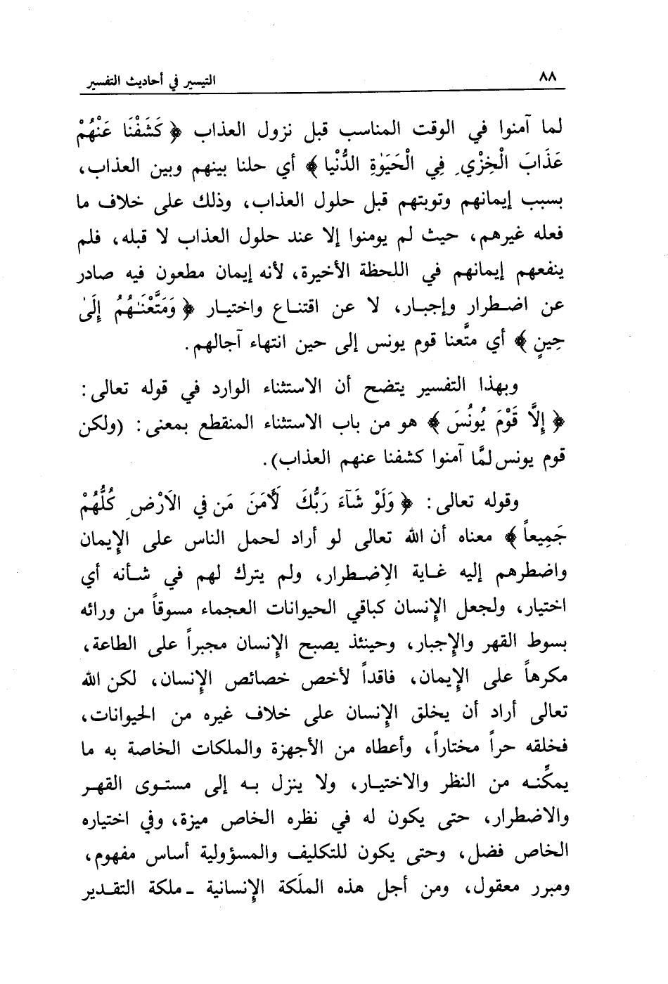 وقوله تعالى: {وَلَوْ شَاءَ رَبُّكَ لَآمَنَ مَنْ فِي الْأَرْضِ كُلُّهُمْ جَمِيعًا} معناه أن الله تعالى لو أراد لحمل الناس على الإيمان واضطرهم إليه غاية الاضطرار، ولم يترك لهم في شأنه أي اختيار، ولجعل الإنسان كباقي الحيوانات العجماء مسوقا من ورائه بسوط القهر والإجبار، وحينئذ يصبح الإنسان مجبرا على الطاعة، مكرها على الإيمان، فاقدا لأخص خصائص الإنسان، لكن الله تعالى أراد أن يخلق الإنسان على خلاف غيره من الحيوانات، فخلقه حرا مختارا، وأعطاه من الأجهزة والملكات الخاصة به ما يمكنه من النظر والاختيار، ولا ينزل به إلى مستوى القهر والاضطرار، حتى يكون له في نظره الخاص ميزة، وفي اختياره الخاص فضل، وحتى يكون للتكليف والمسؤولية أساس مفهوم، ومبرر معقول، ومن أجل الملكة الإنسانية -ملكة التقدير